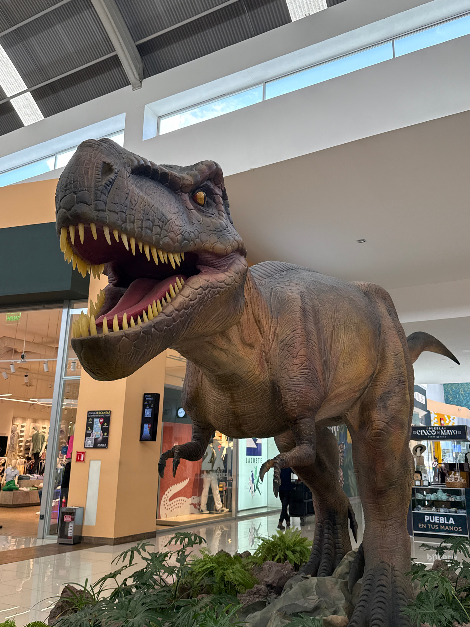 The image shows a large, animatronic model of a Tyrannosaurus Rex dinosaur, displayed inside a shopping mall or commercial space. The dinosaur's mouth is open, revealing teeth and a tongue. The interi…read more
