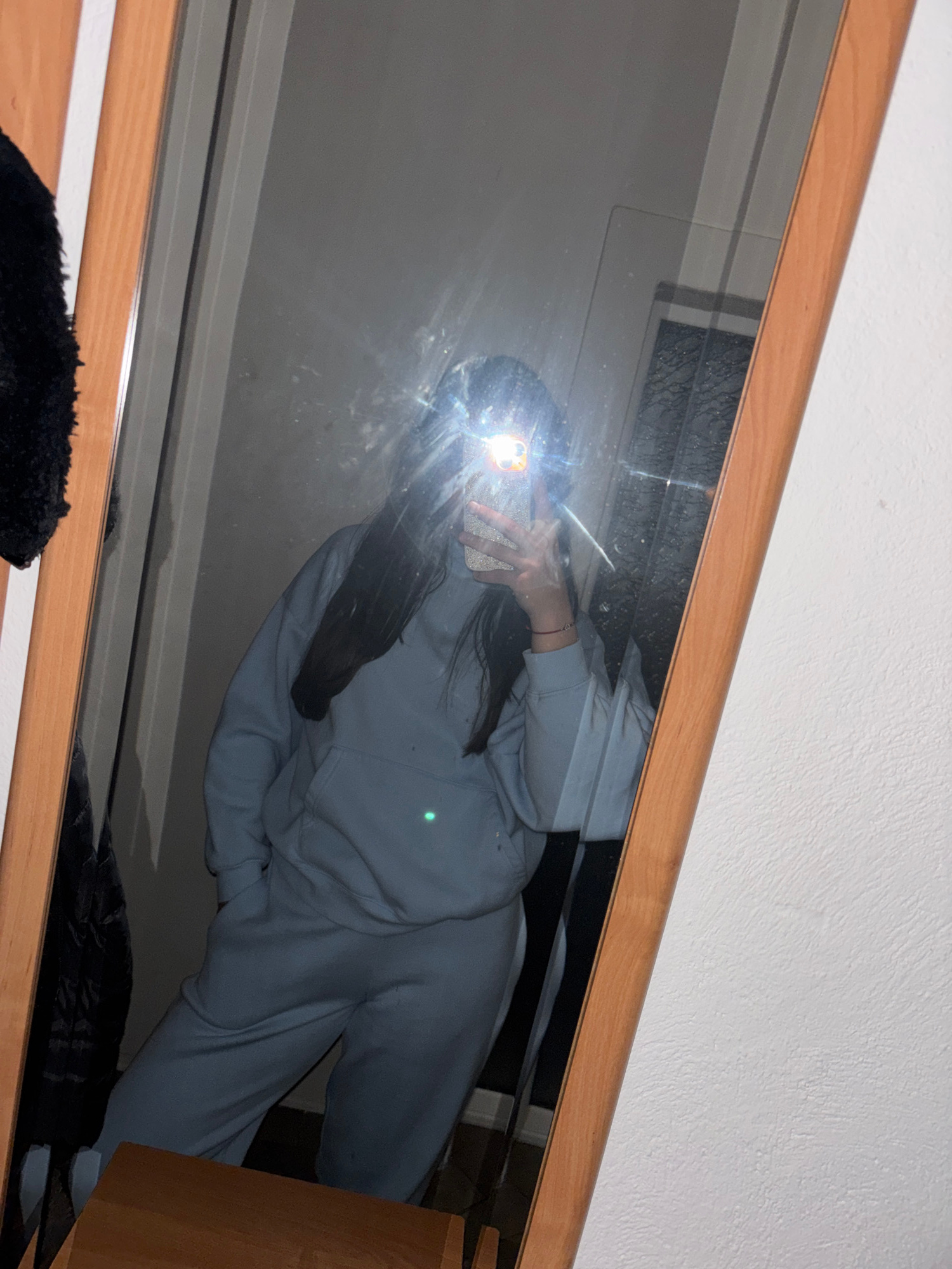 A woman is reflected in a mirror. The woman is wearing a light blue sweat suit and holding a cell phone in front of her face. The mirror is framed in wood and is tilted at an angle. The background inc…read more