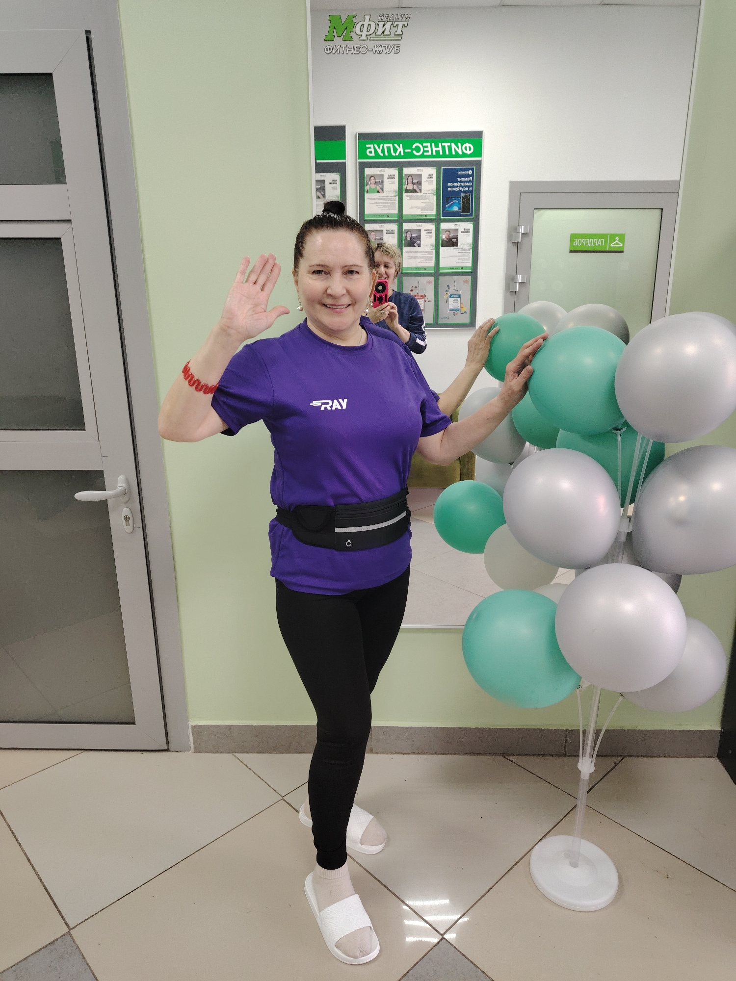 A middle-aged woman is standing in what appears to be an indoor fitness center, possibly in Sarapul, Russia, given the Cyrillic text on the wall. The woman is wearing a purple T-shirt with the word "R…read more