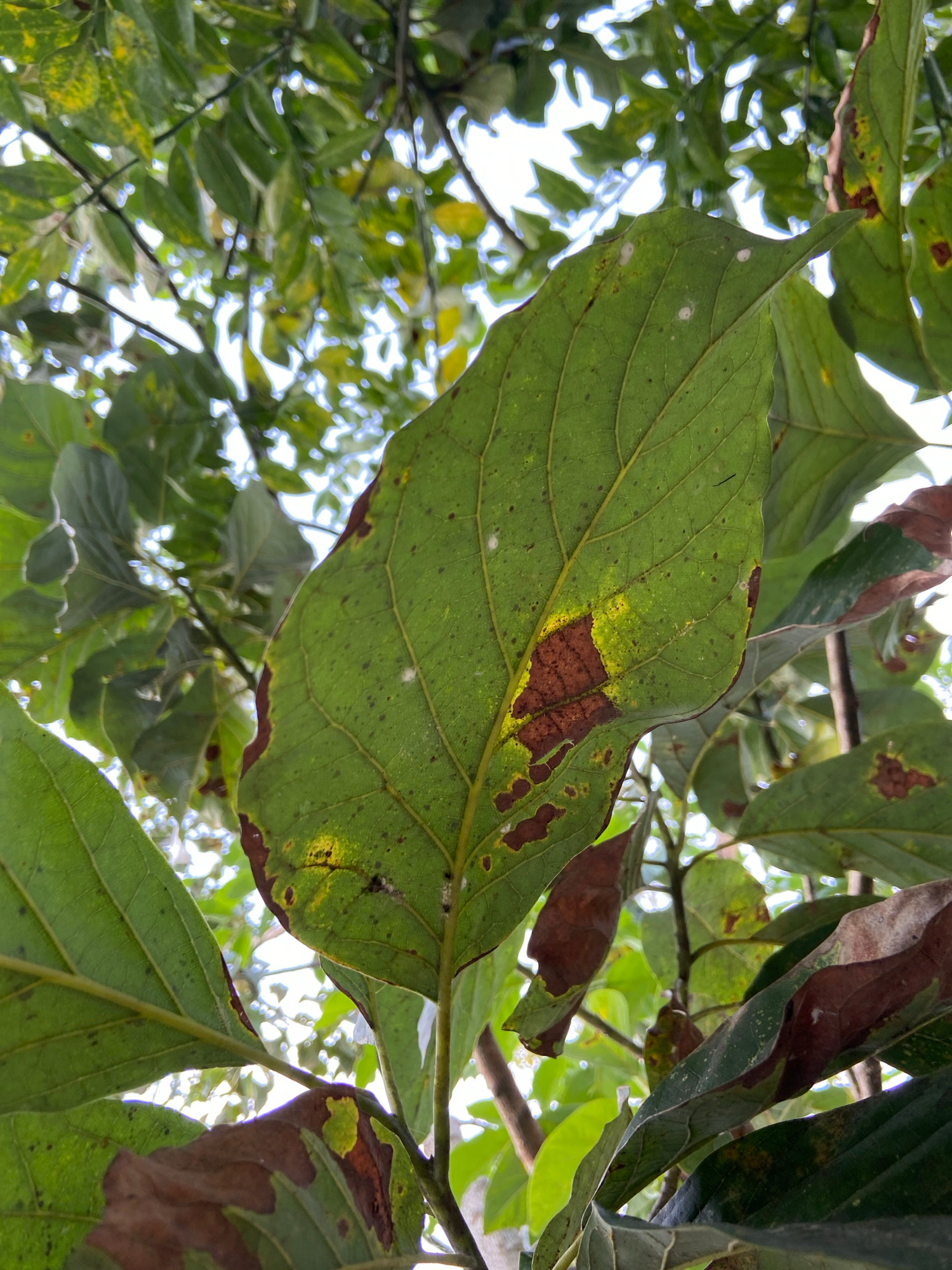 The image depicts a cluster of green leaves, some showing signs of browning and discoloration, possibly due to disease or environmental stress. The leaves are arranged in a dense canopy, with a glimps…read more