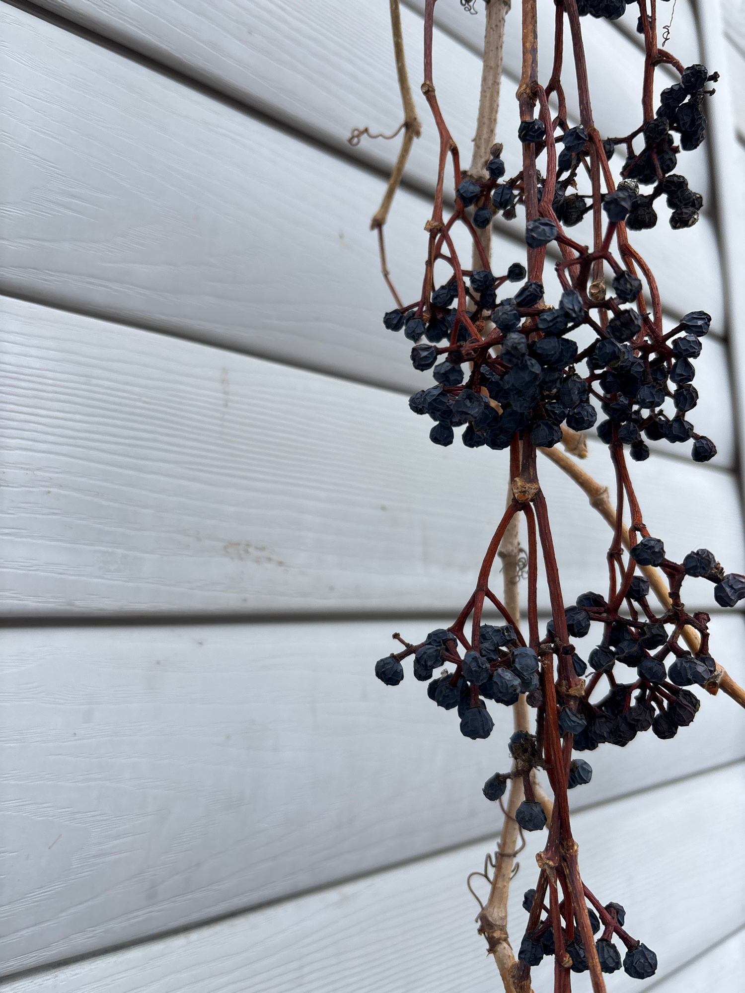 The image shows dead Virginia creeper vines draped over white painted siding. The vines have dried, dark berries attached. The location is not indicated in the image. There is no indication this photo…read more