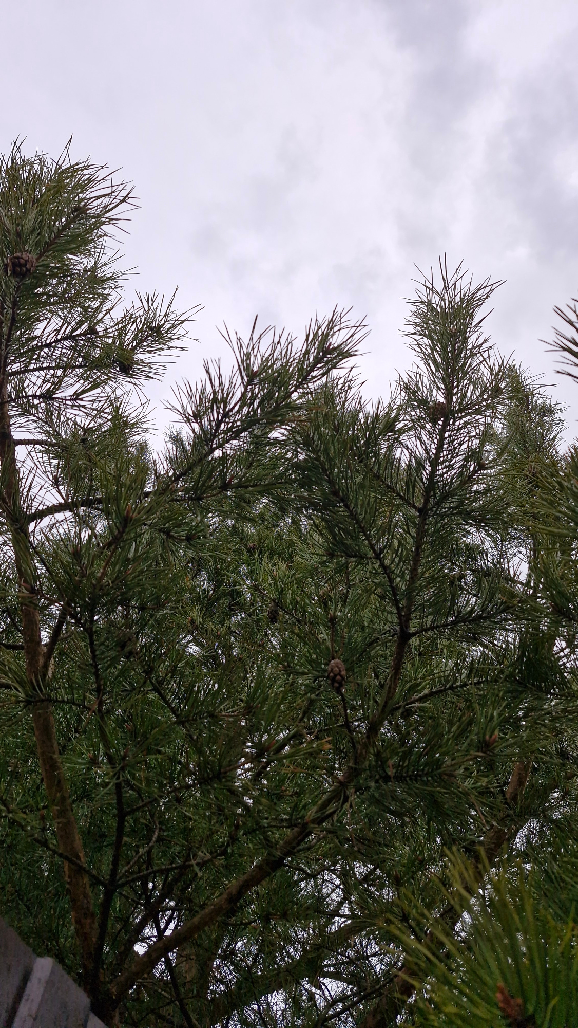 The image shows a view looking up into the branches of a pine tree against a cloudy, overcast sky. Several pine cones are visible among the needles. The location is Otchor, Russia.