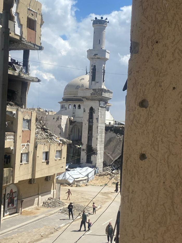 The image depicts a scene of extensive destruction on a sunny day with scattered clouds in Khan Yunis, Palestinian Territory. In the mid-ground, a large mosque features a prominent light-colored dome…read more