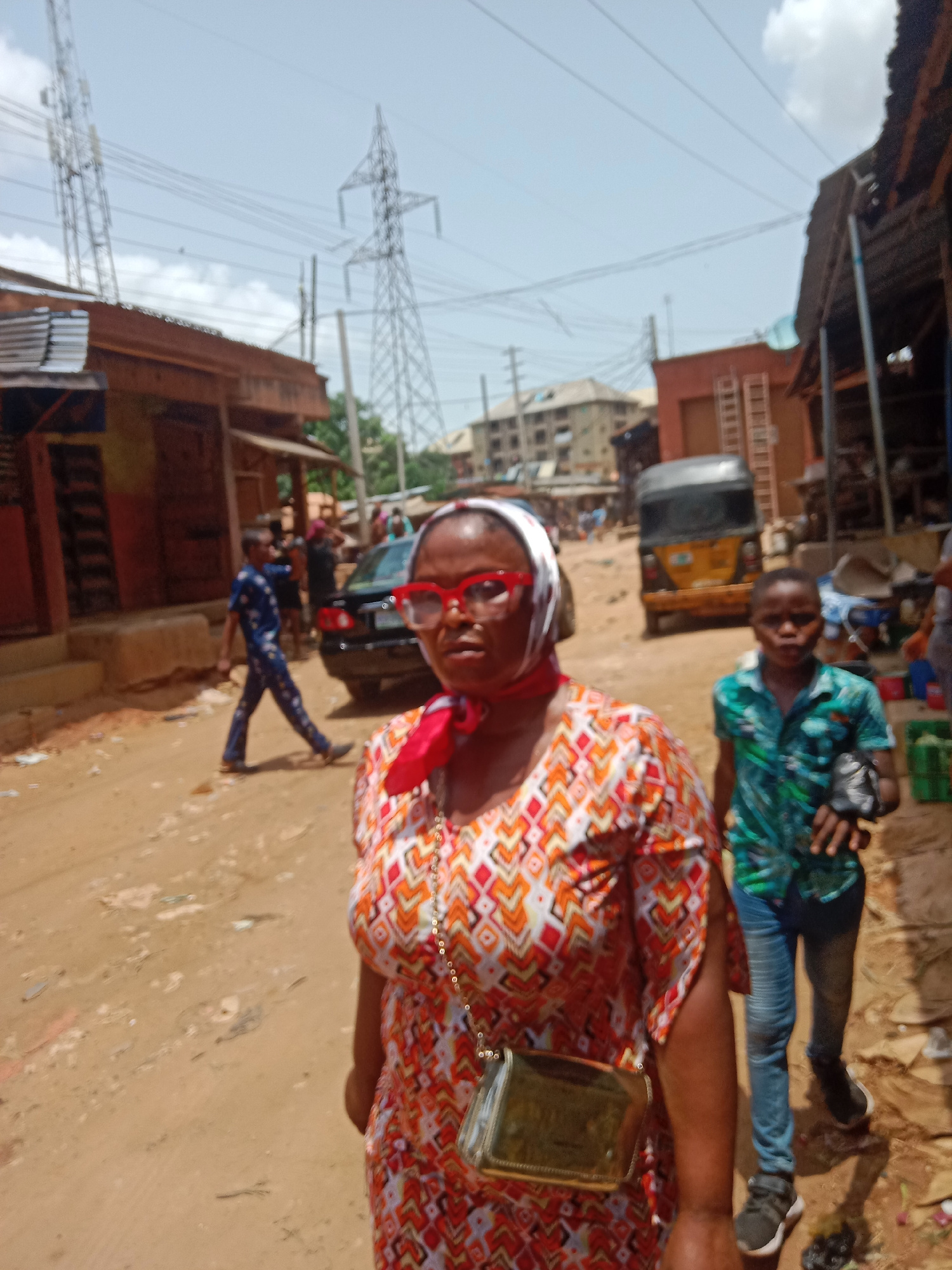 A woman wearing a patterned dress, red glasses, and a headscarf is in the foreground of a street scene in Onitsha, Nigeria. A young boy in a green shirt and jeans walks beside her. Behind them, a yell…read more