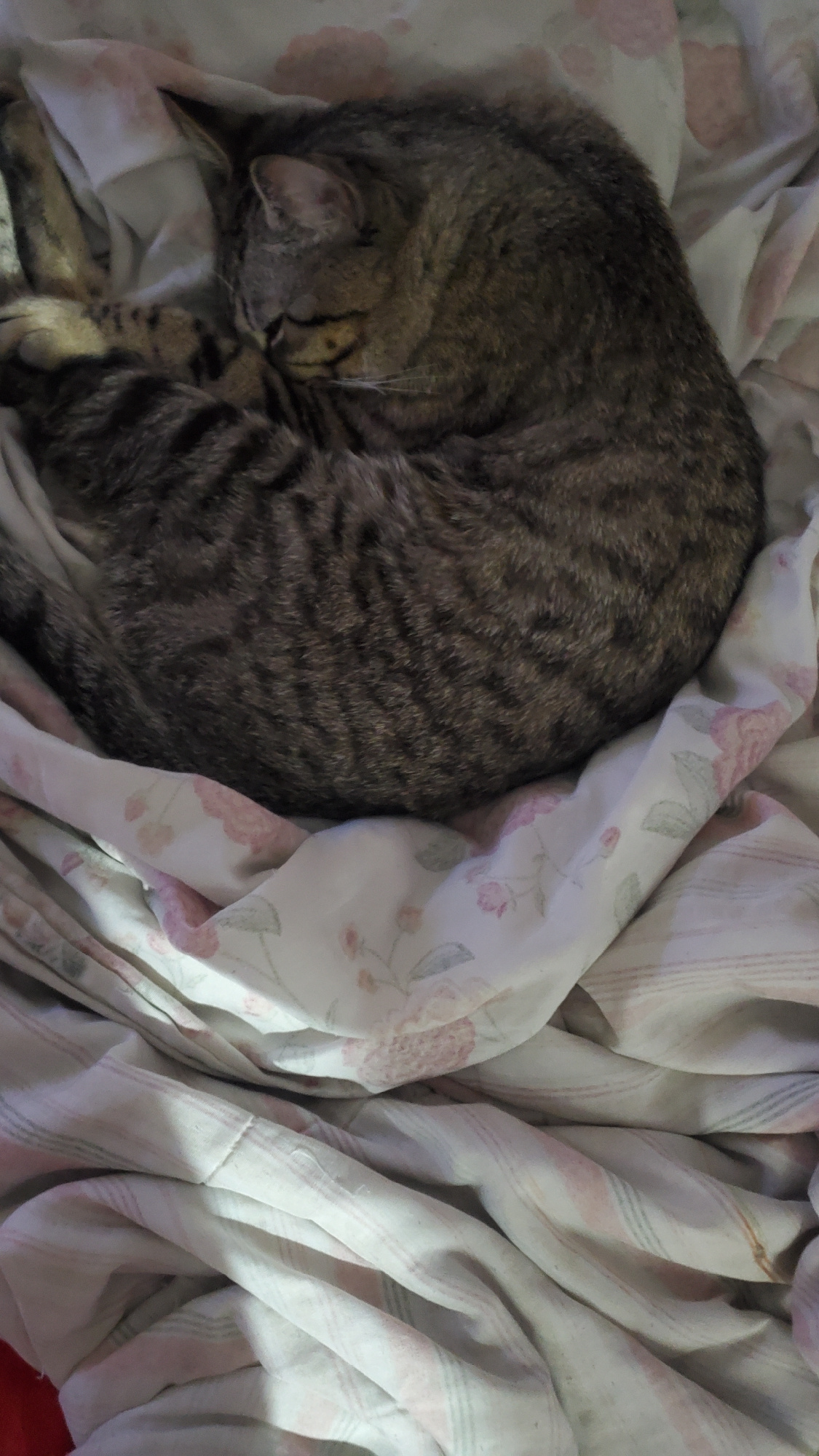 A tabby cat is curled up asleep on a bed covered in patterned bedsheets. The cat is positioned on the left side of the image, its head tucked in towards its body. The bedsheets have a pattern of pink…read more