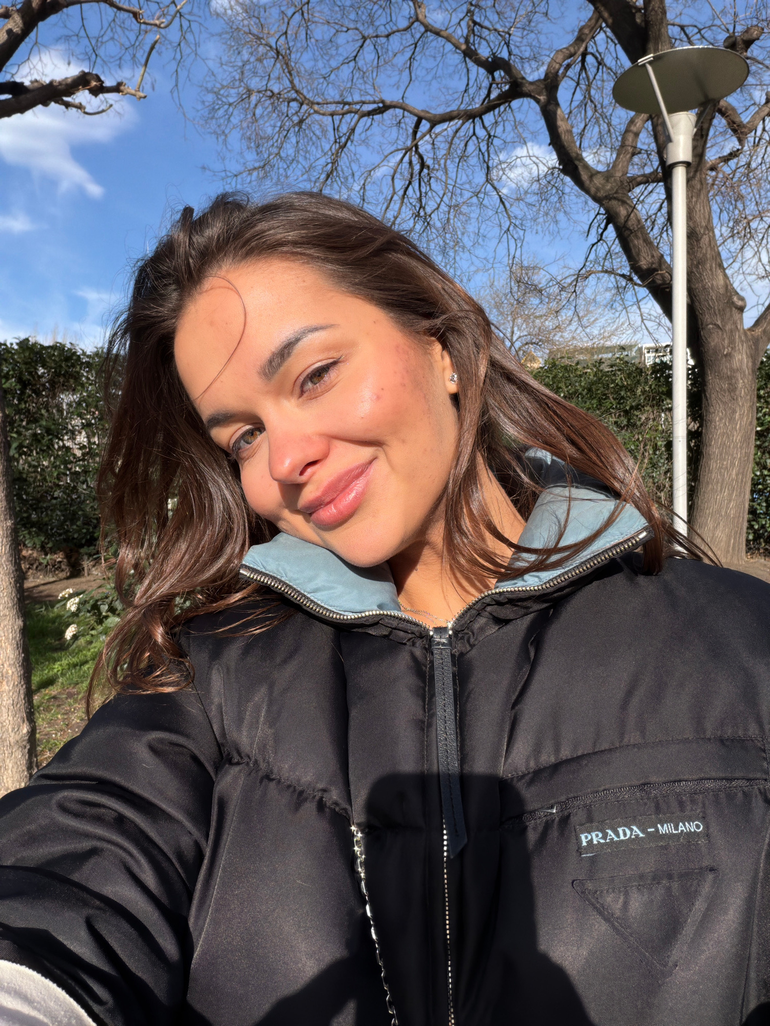 A young woman poses for a selfie in Tbilisi, Georgia. She wears a black Prada puffer jacket with a light blue inner lining. Trees and a lamppost with a round light fixture are visible in the backgroun…read more