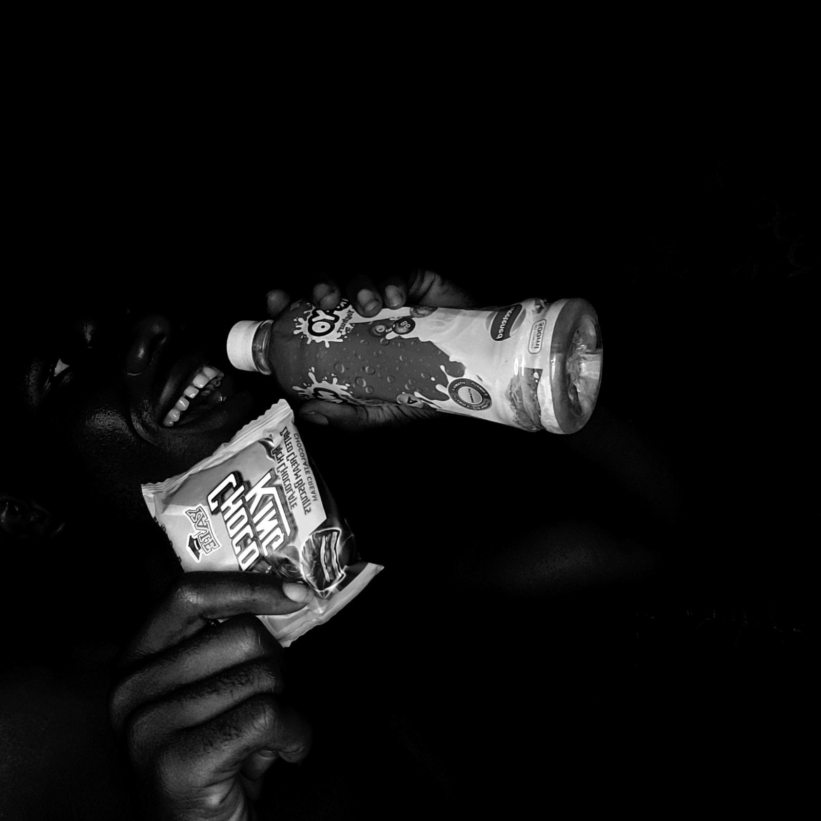 A grayscale photograph reveals a person holding a yogurt drink and a chocolate bar. The hand holding the yogurt drink, labeled "OY Yogurt", is positioned near the top of the image, while the other hanβ¦read more