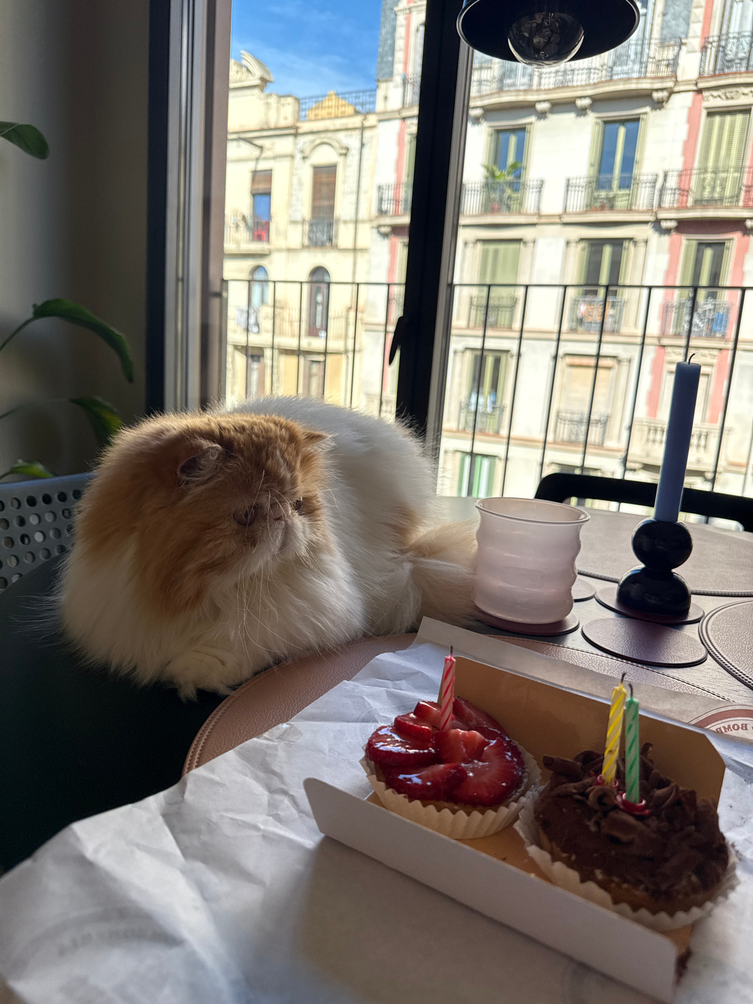 The image depicts a tan and white cat lying on a dark surface next to a small box containing two cupcakes, one with chocolate frosting and the other with sliced strawberries, each adorned with candlesβ¦read more