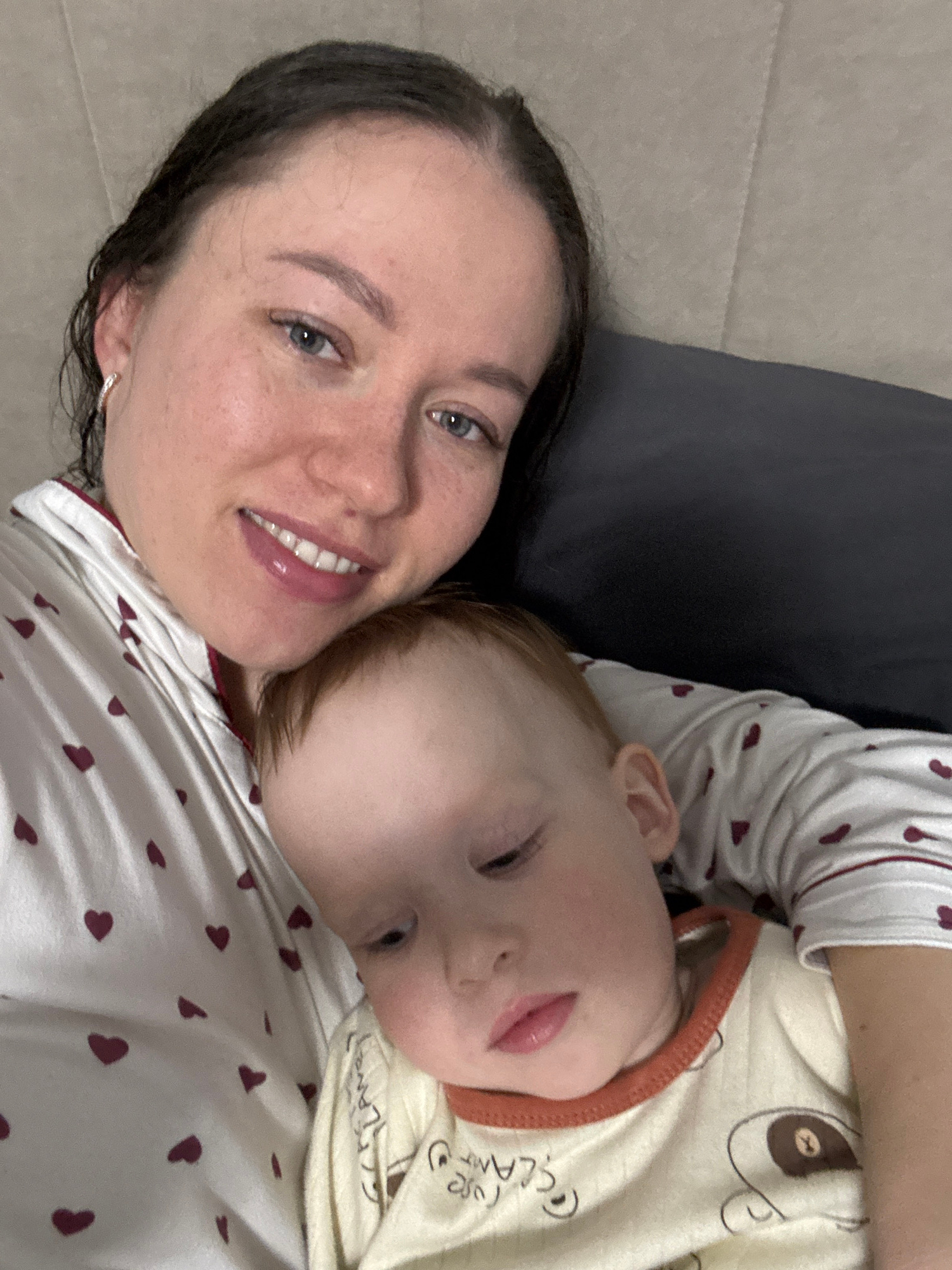 A selfie shows a woman and a young child lying down together. The woman is smiling, with dark hair and blue eyes. The child is resting on the woman, with red hair and closed eyes. Both are wearing pat…read more
