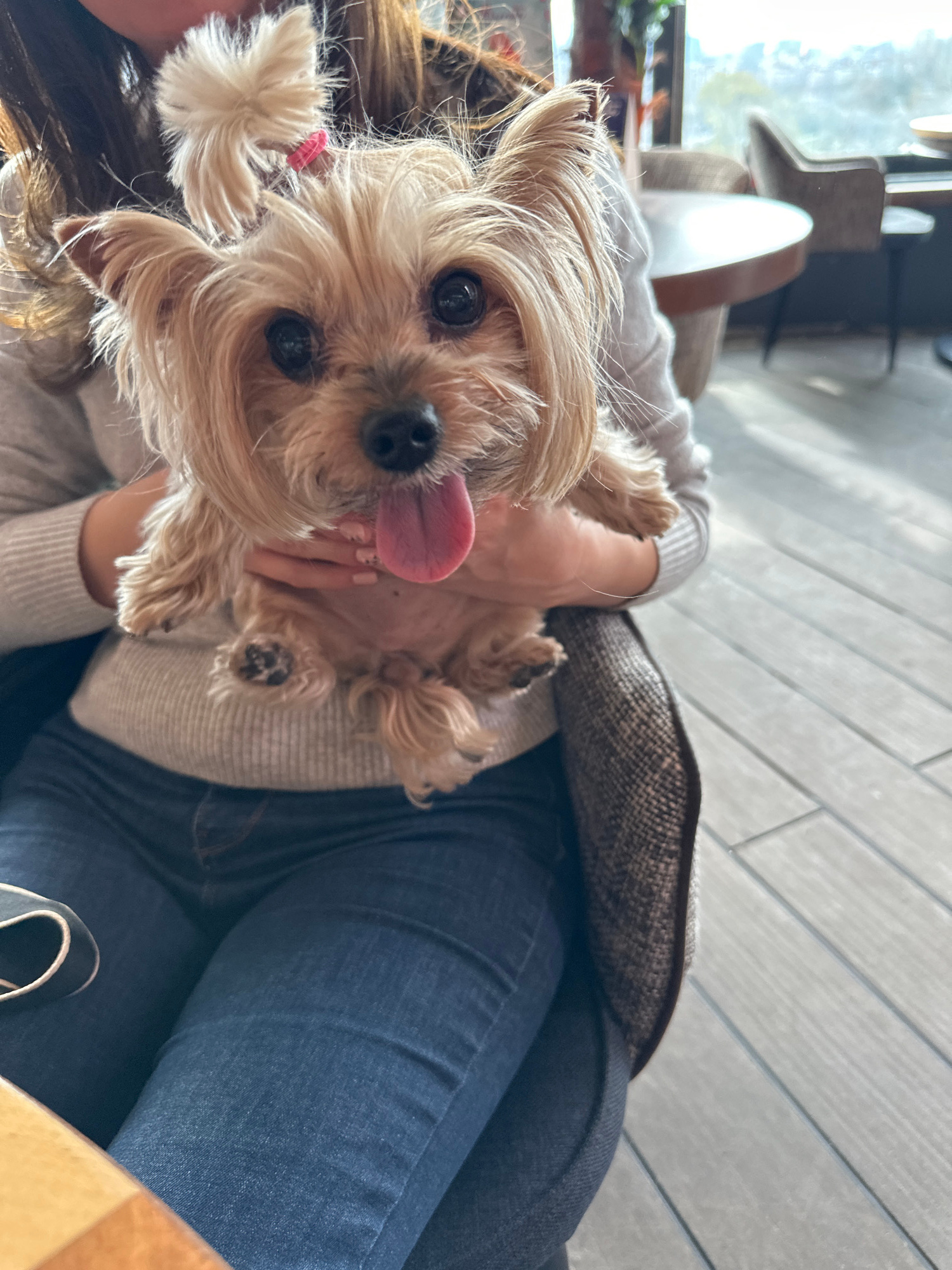 A person is holding a small, light brown dog in their arms. The dog is on its back, with its tongue sticking out. The person is wearing a light gray sweater and dark blue jeans. There is a pillow behi…read more