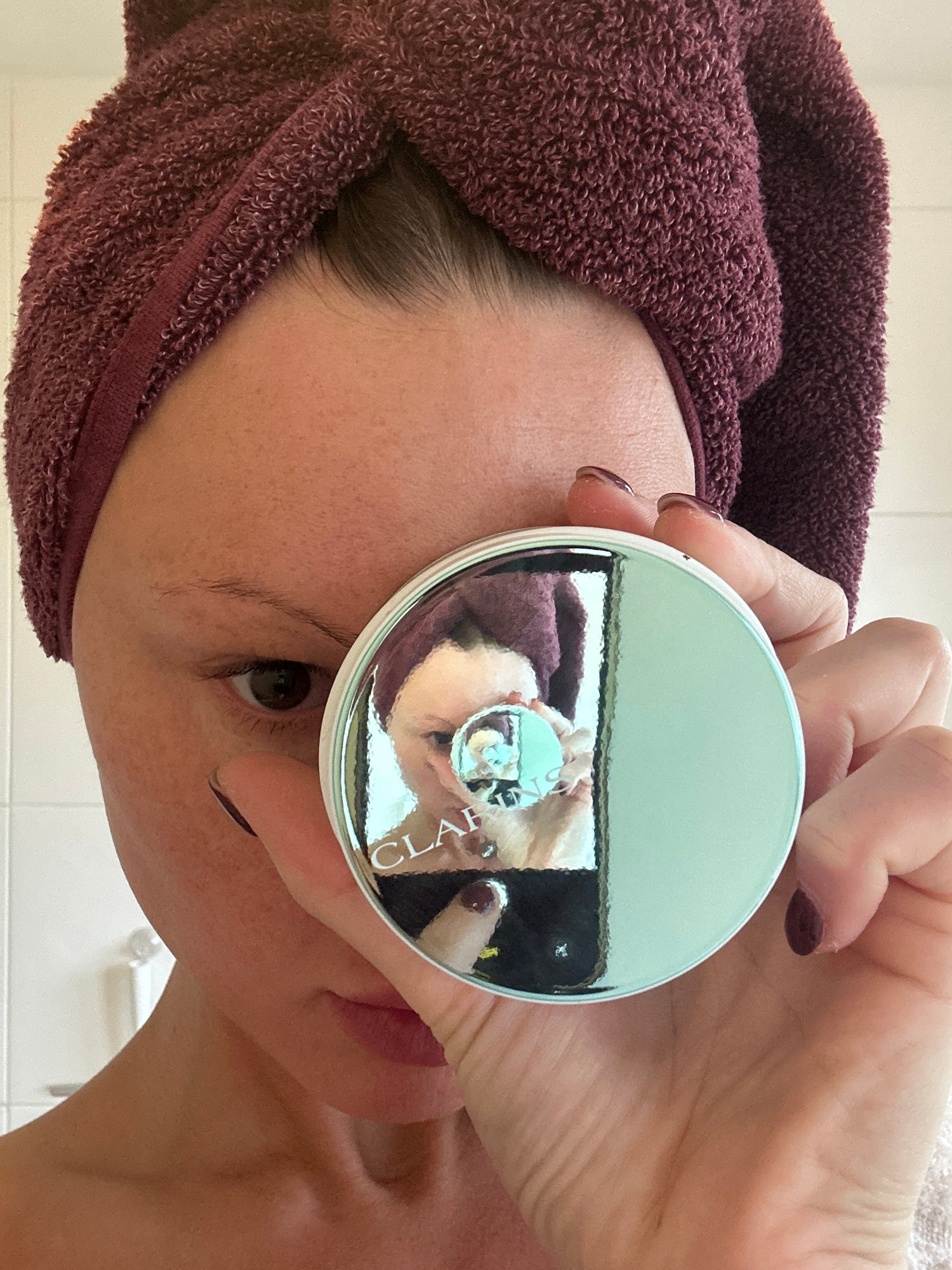 A person with a burgundy towel wrapped around their head is holding up a mirrored container in front of their face. The container is silver-green with a silver rim. The reflection in the container sho…read more