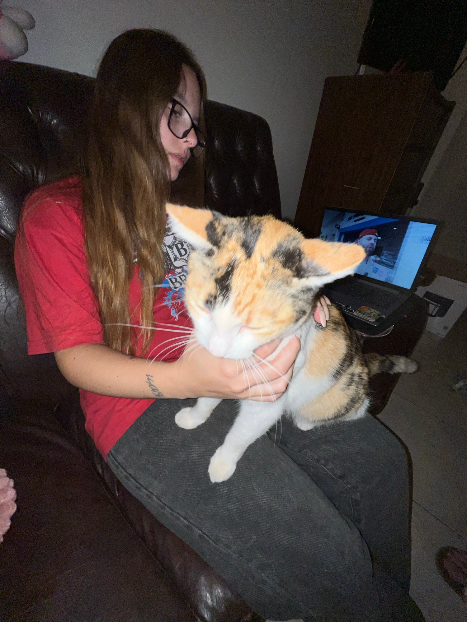 A woman with long brown hair and glasses is lying on a dark brown leather couch, wearing a red shirt and dark jeans. She is holding a calico cat with her right hand, its head resting on her chest. The…read more