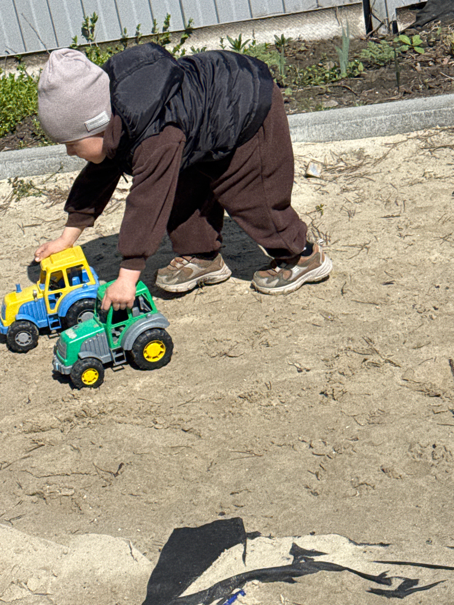 A child is playing with toy trucks on a sandy surface. The child is wearing a brown long-sleeved shirt, brown pants, a black vest, a gray hat, and tan and brown sneakers. The trucks are blue, yellow,…read more