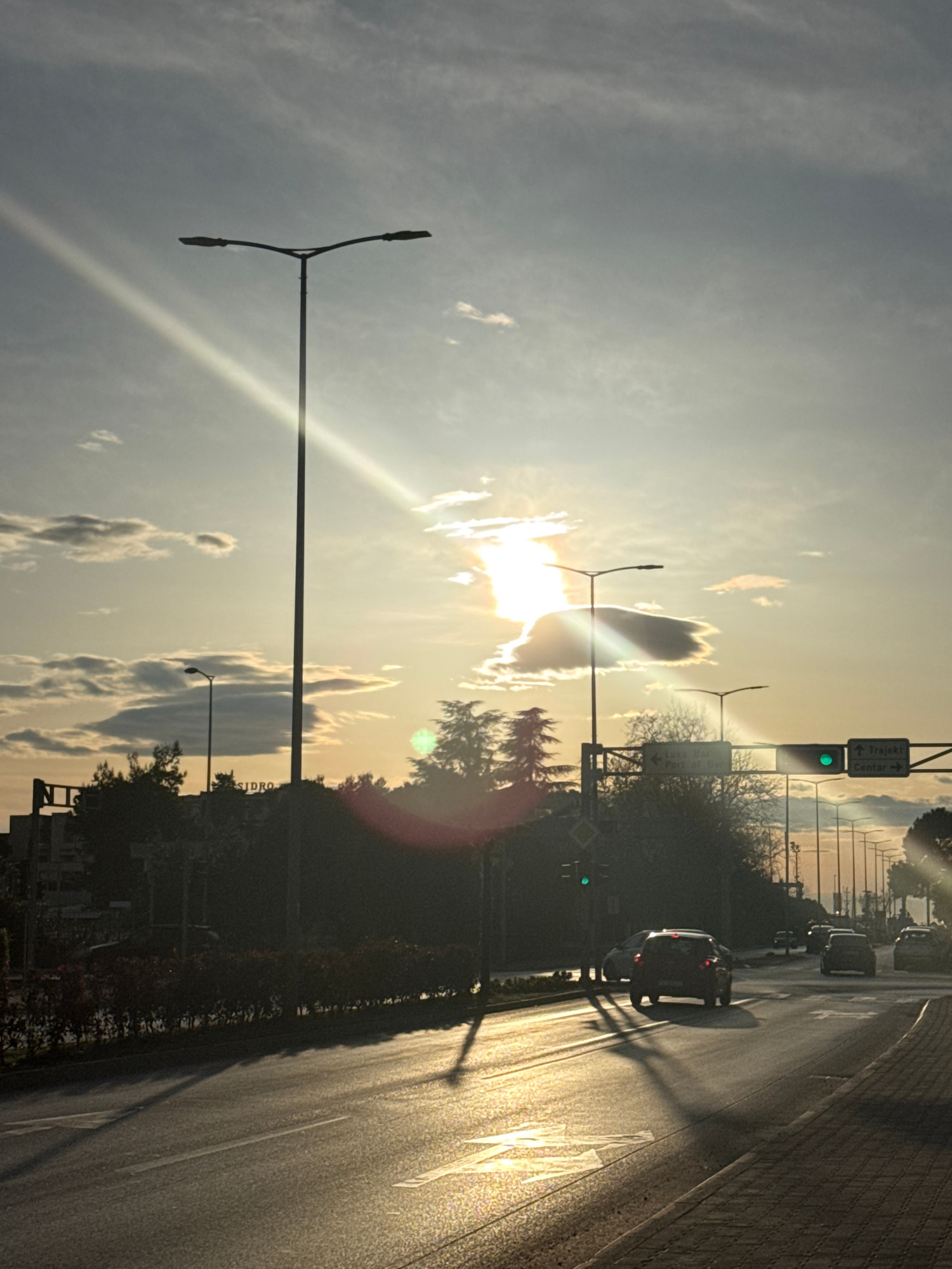 The image shows a road in Bar, Montenegro, with cars driving along it. The sun is setting or rising, creating glare and silhouetting some of the objects in the scene. There are streetlights lining the…read more