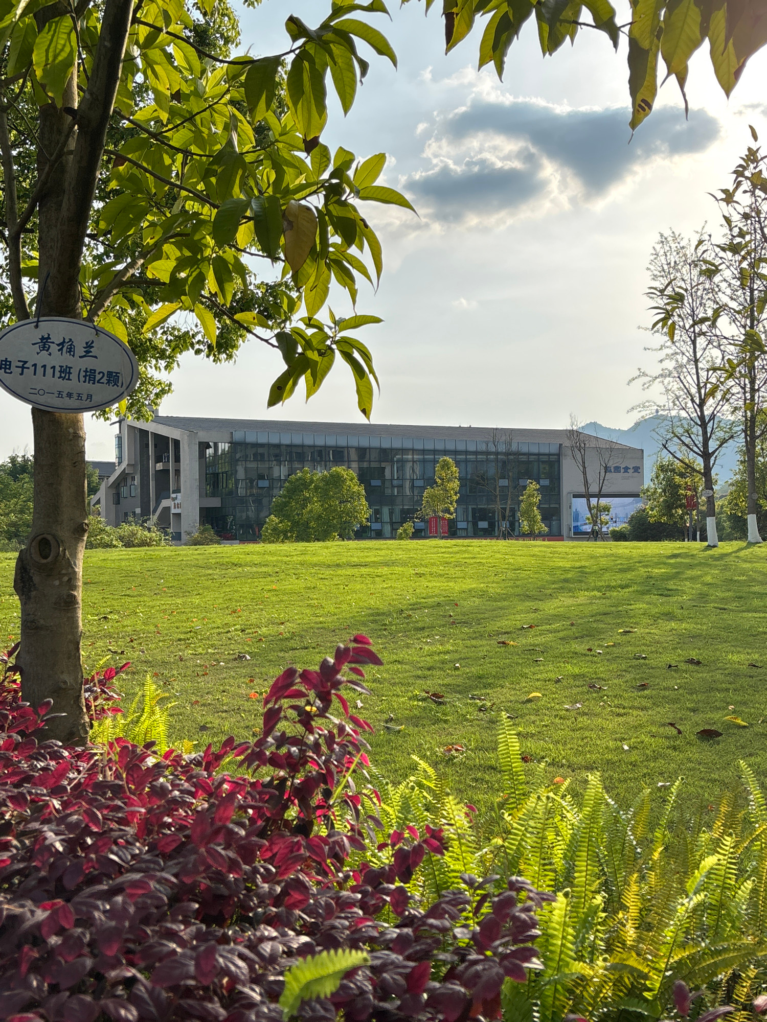 Here is a description of the image: The image shows a landscape scene with lush greenery, including grass, red-leaved plants, and trees. In the background, a modern building with a glass facade is vi…read more