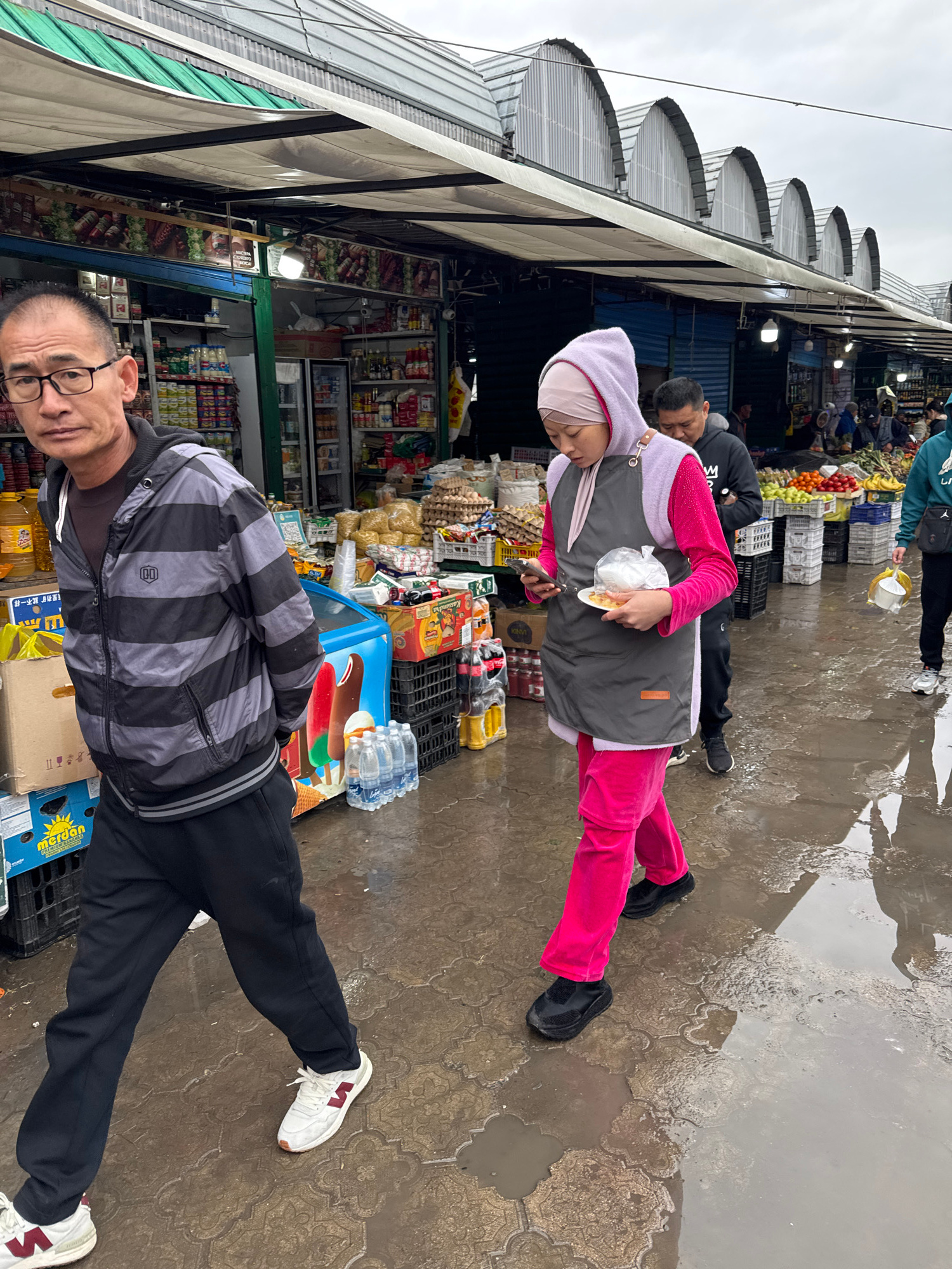 The image captures a vibrant, albeit damp, outdoor market scene in Bishkek City, Kyrgyzstan. The weather appears overcast, and recent rain is evident from the wet, puddle-strewn paved ground. In the…read more