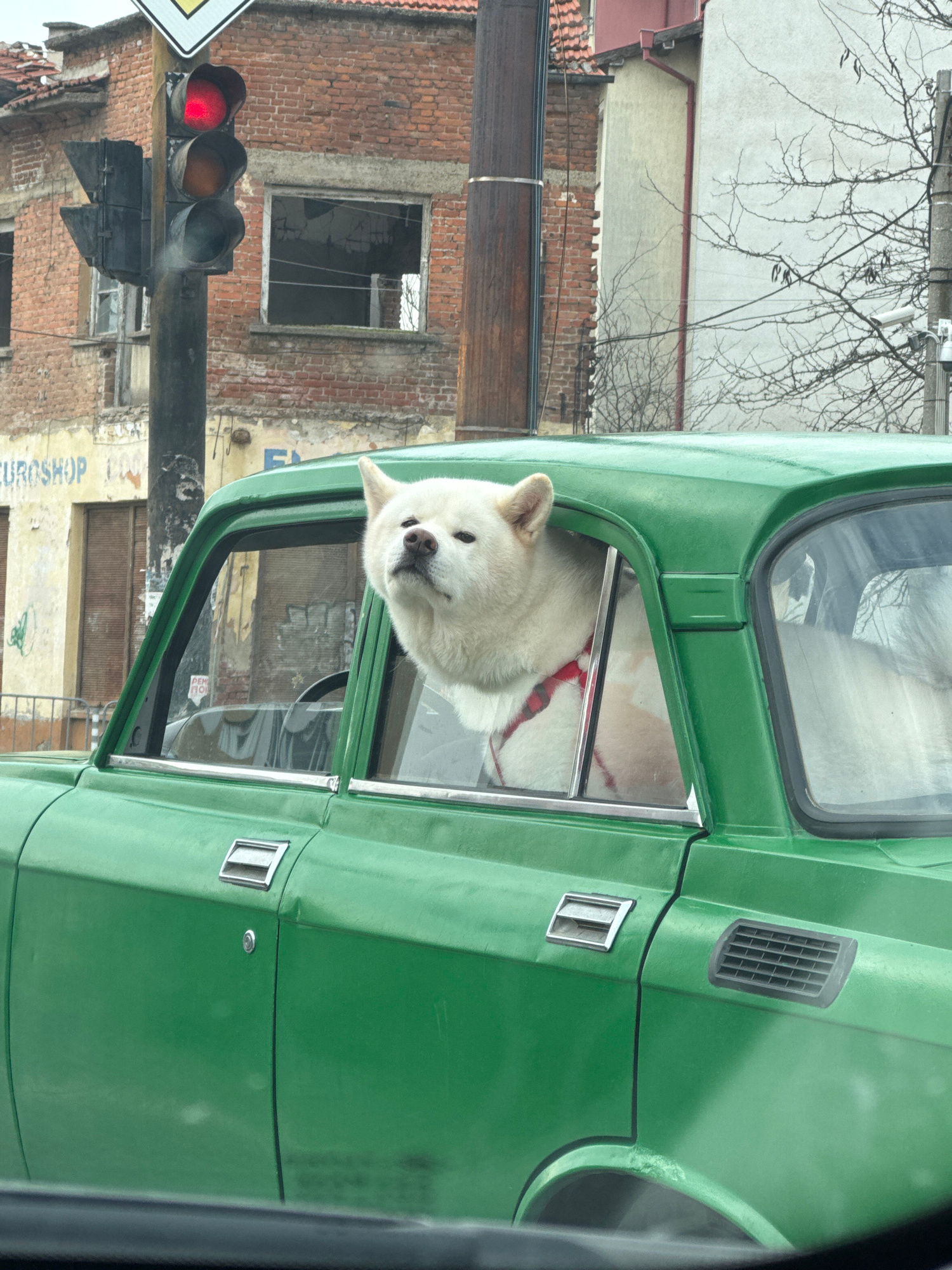 A photograph shows a white Akita-type dog with its head protruding from the partially open window of a light green vehicle, likely a car. The dog is wearing a red harness. The vehicle is stopped at a…read more
