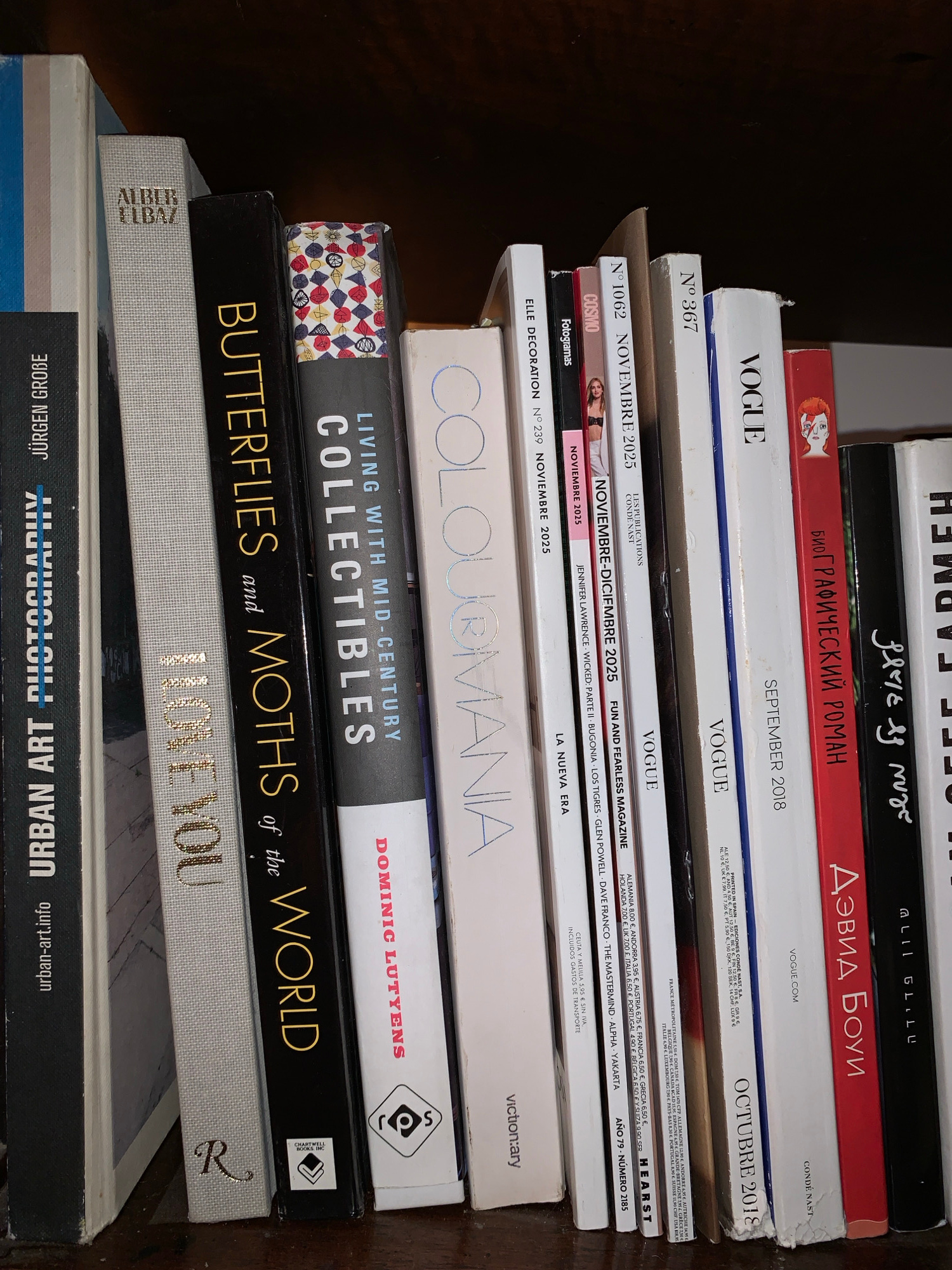 A vertical, eye-level photograph captures a tightly packed section of a bookshelf displaying various books and magazines in an indoor setting. The items rest on a dark, possibly wooden, shelf surface…read more