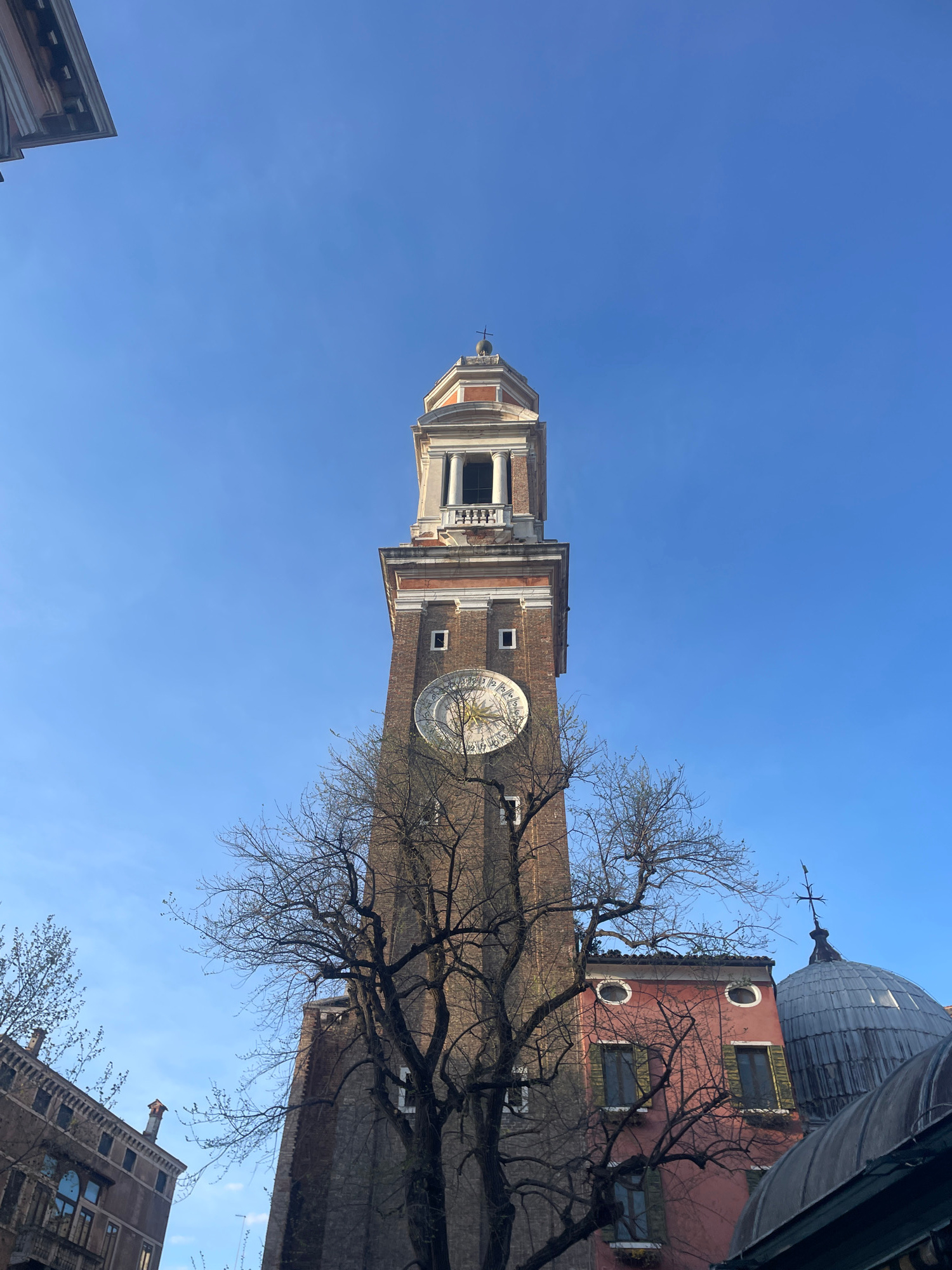 The image depicts the leaning campanile (bell tower) of Santo Stefano in Venice, Italy, partially obscured by bare tree branches. The tower, constructed of brick, features a clock face and a white-tri…read more