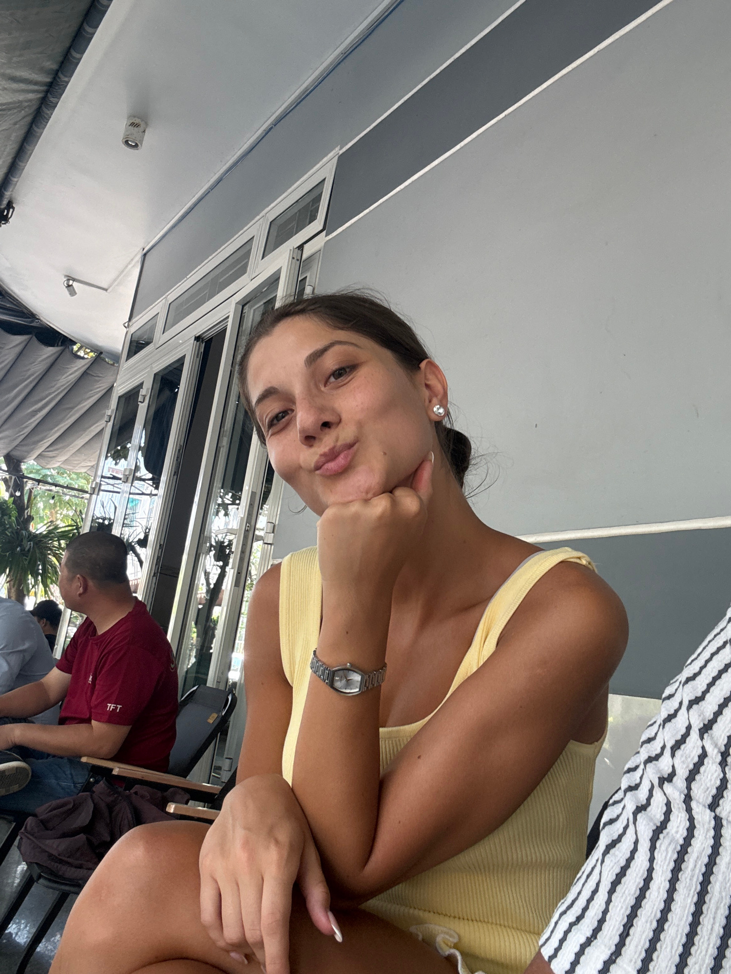 A woman with brown hair in a low bun, wearing a yellow tank top and a wristwatch, rests her chin on her hand. She is seated at a table near a window. In the background, a man wearing a red shirt is se…read more