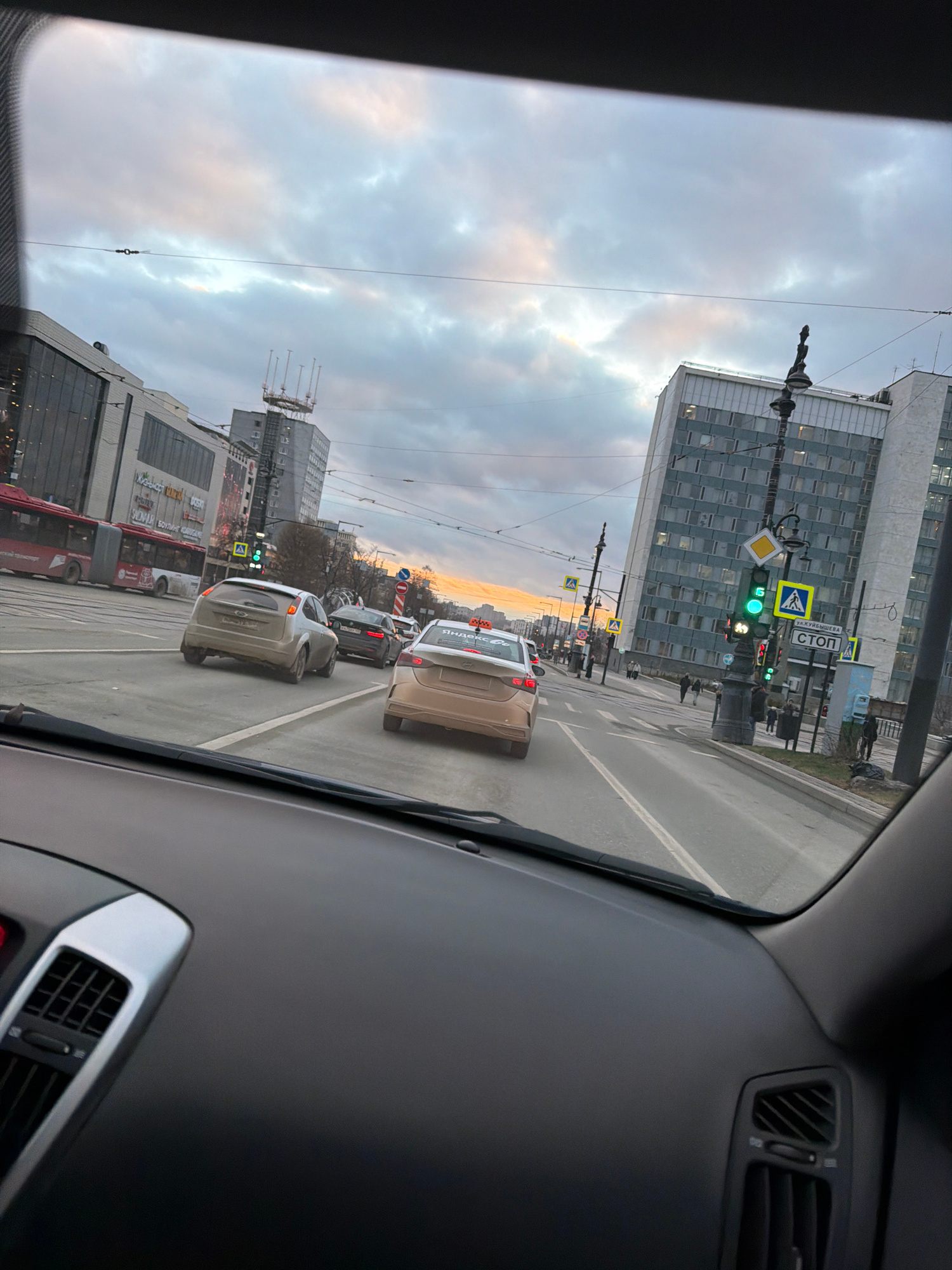 The view is from inside a car, looking out onto a street in Perm, Russia. Traffic is moving along the road. A tall, Soviet-era building is visible on the left, with smaller commercial buildings at its…read more