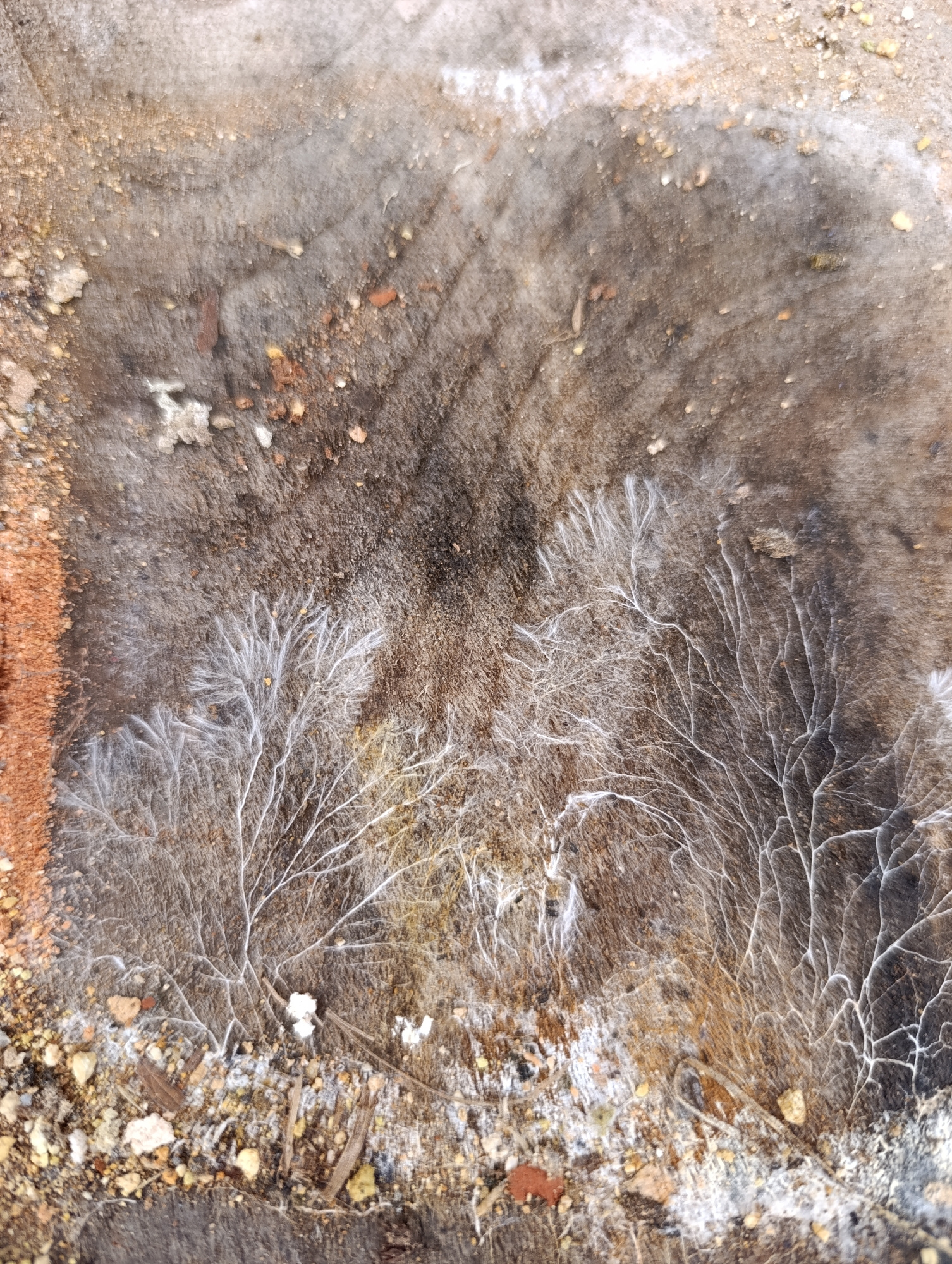 The image depicts a close-up view of a decaying tree stump or large piece of wood, likely outdoors. The surface is heavily weathered, with visible cracks, stains, and a general worn texture. There's a…read more