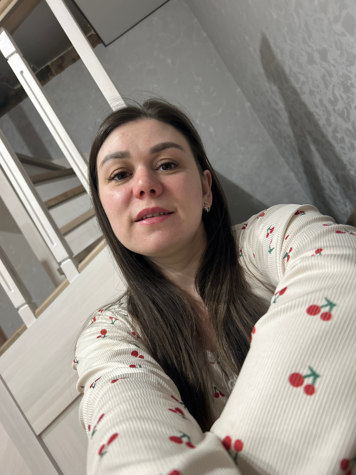 A woman with long brown hair and brown eyes is taking a selfie. She is wearing a white, long-sleeved shirt with a cherry print. She is indoors, seemingly in a room with white walls and a white, partia…read more