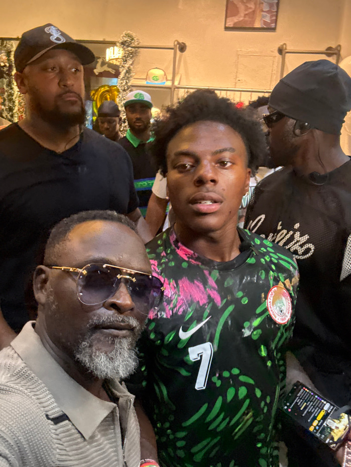 A group selfie includes six individuals. The main focus is a young man with dark hair and a patterned green and black jersey with a white Nike logo and the number '7'. He is surrounded by older men. O…read more