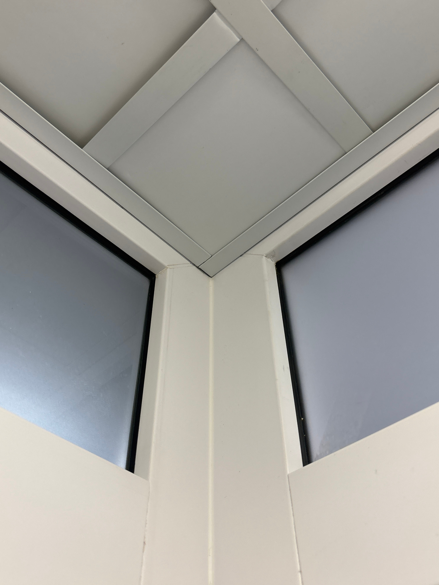 The image shows a close-up view of a white window frame intersecting with a white paneled wall. Two sections of glass are visible within the window frame, appearing gray. The paneled wall features a d…read more
