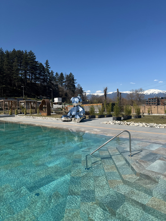 This image depicts an outdoor swimming pool area in Bania, Bulgaria, under a clear blue sky on a bright, sunny day. In the foreground, a turquoise-tiled pool with visible underwater steps and a stainl…read more