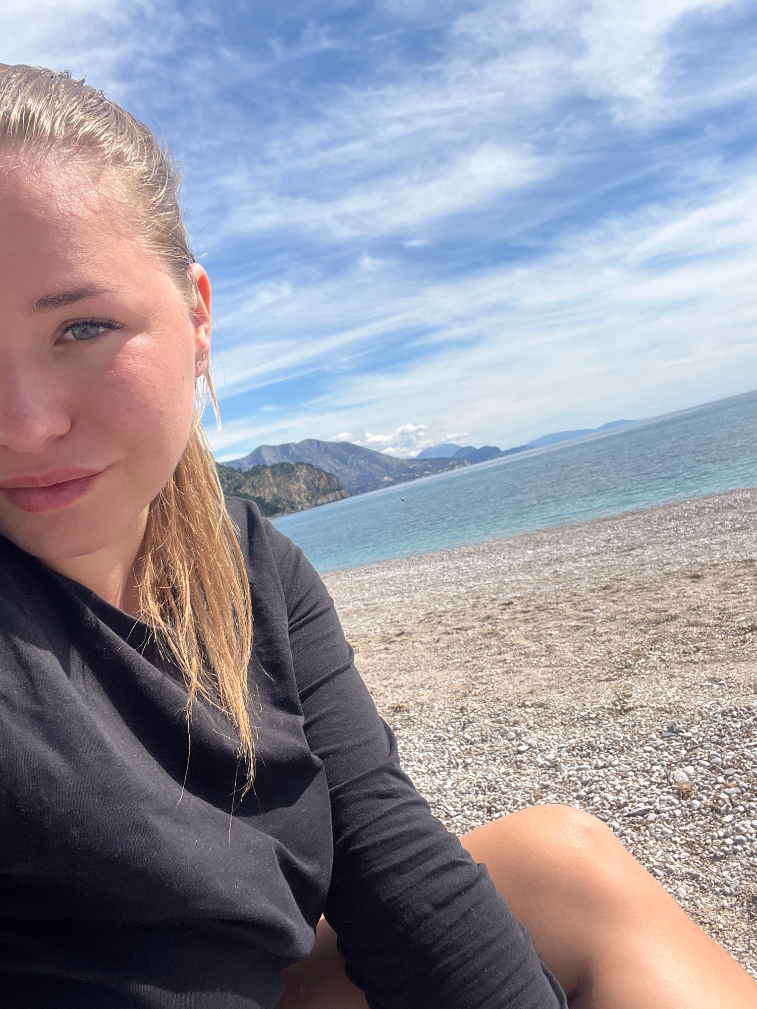 A selfie shows a blond woman in a black long-sleeved shirt on a rocky beach with a body of water and mountains in the background under a cloudy sky. It's likely taken in or near Prijevor, Montenegro,β¦read more
