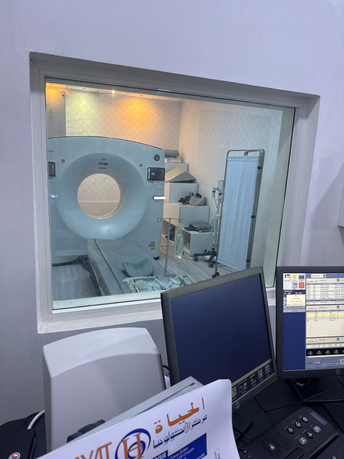 From a window perspective, a CT scanner dominates the view, featuring a circular opening and a patient bed extending from it. Two monitors and a phone are visible in the foreground, along with paperwo…read more