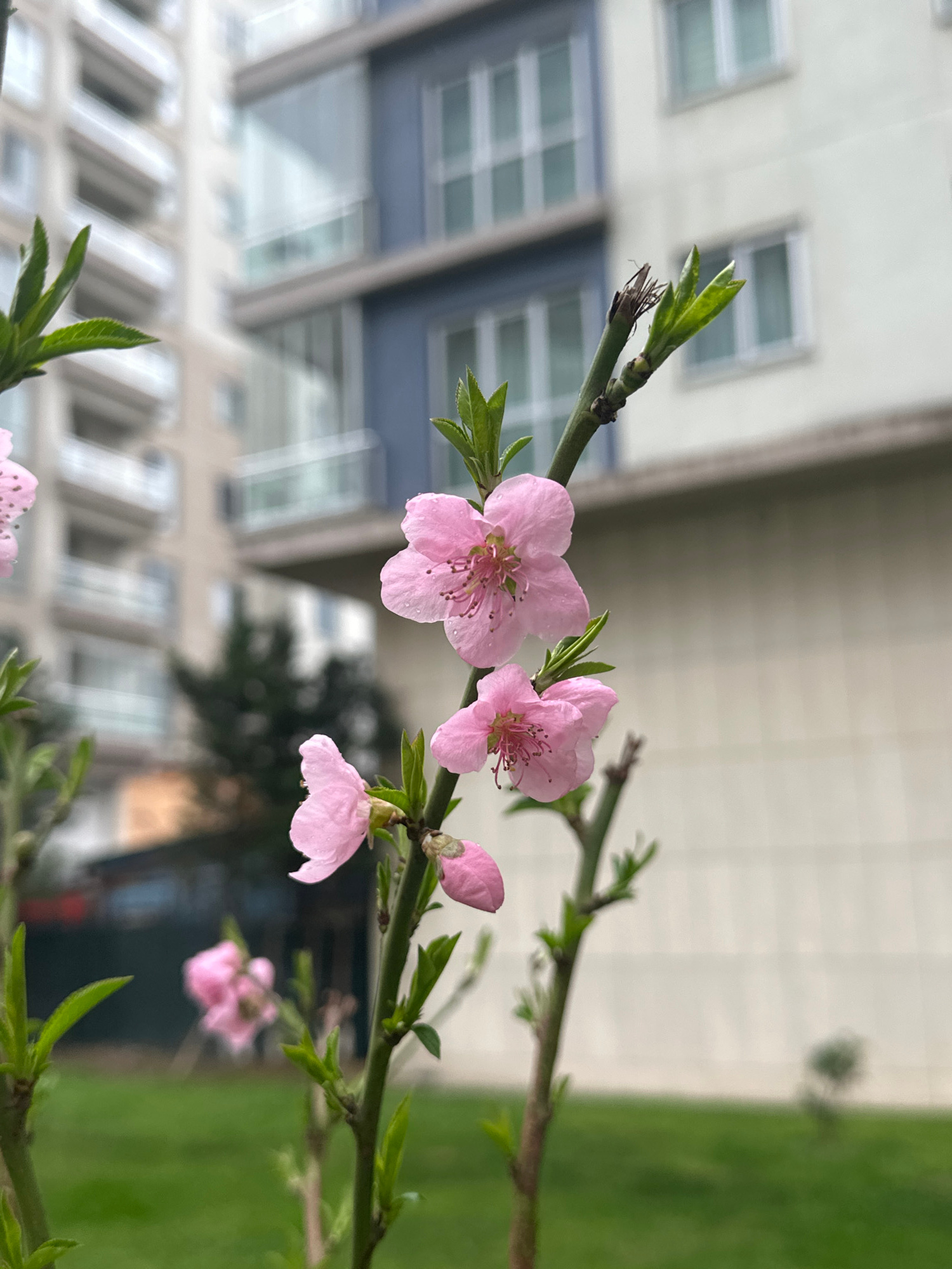The image features a close-up of pink blossoms on a branch, with a building and grassy area blurred in the background. The architecture of the building is modern, with repeating window patterns. The fβ¦read more