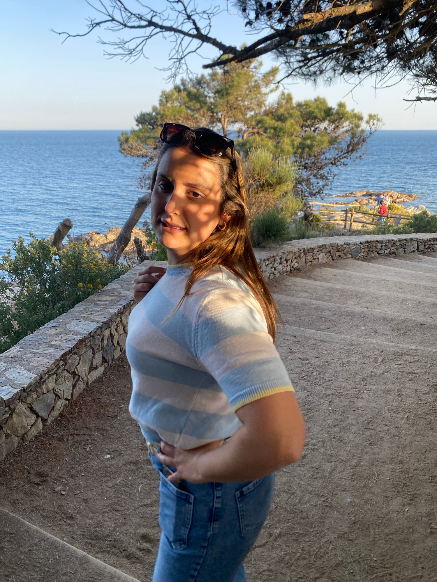The image is a low-angle, rotated portrait of a woman on a stone staircase near the coast. The woman has long brown hair and is wearing sunglasses, a striped top, and blue jeans. She is smiling slight…read more