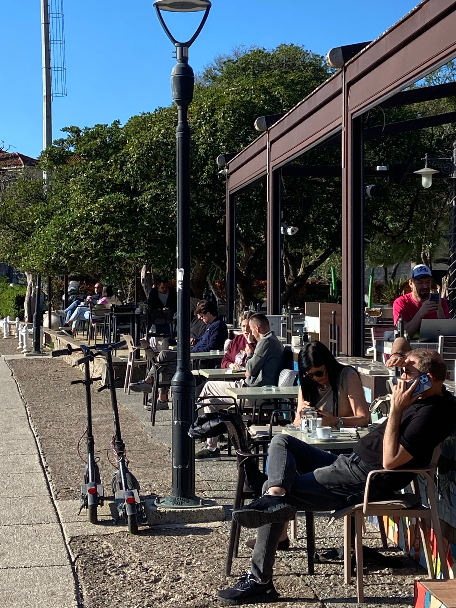 The image shows an outdoor scene in Budva, Montenegro. Several people are seated at tables under a shaded structure, possibly a restaurant or cafe. Some individuals are looking at their phones. Electr…read more
