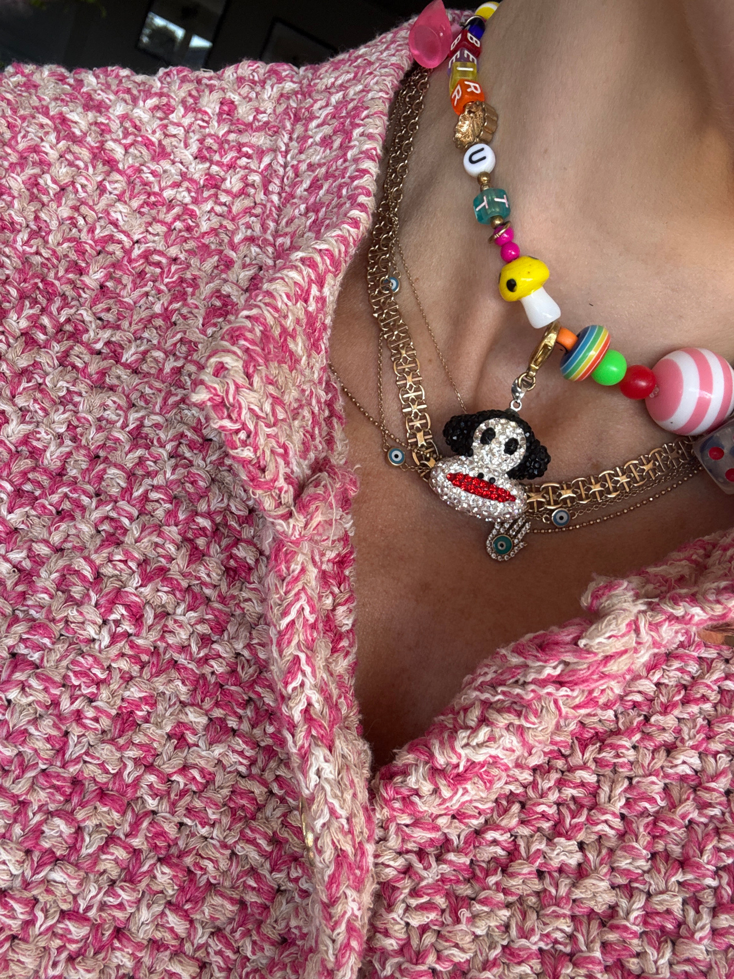 The image shows a close-up of a person wearing multiple necklaces and a pink and cream crocheted top. The necklaces are varied, including one with colorful beads spelling out "BERRY UTT", another with…read more