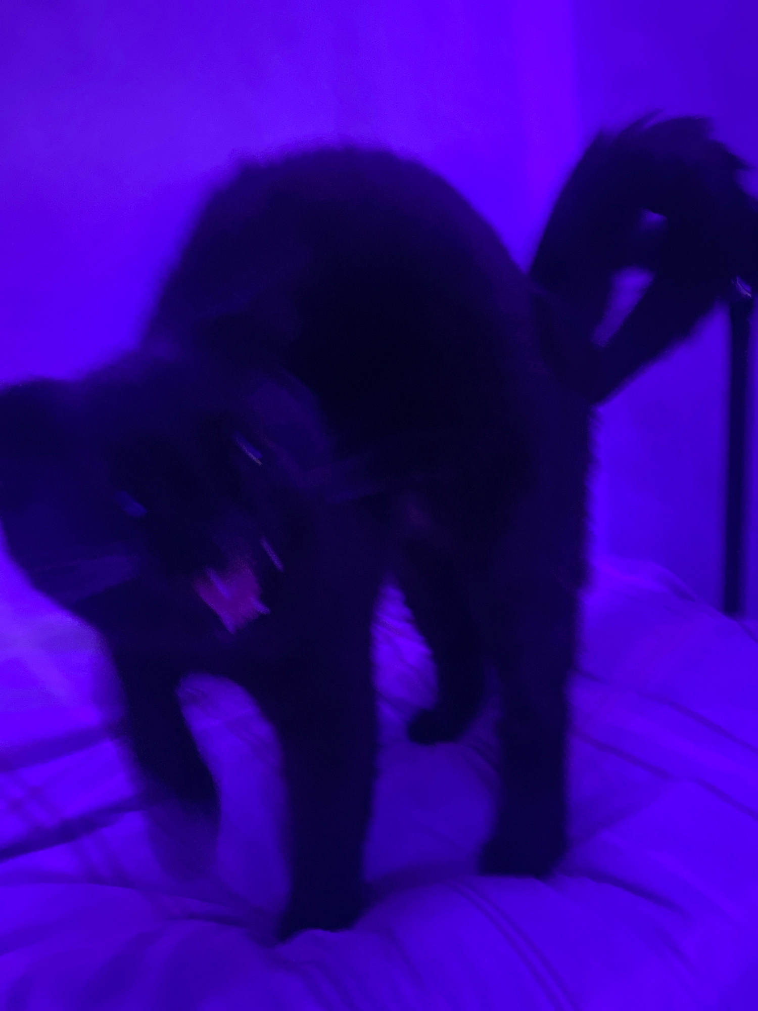 The image depicts a black cat lying on a bed under a blue light. The cat's tail is visible at the top left, and its face is somewhat obscured but appears to be looking towards the camera. The bed has…read more
