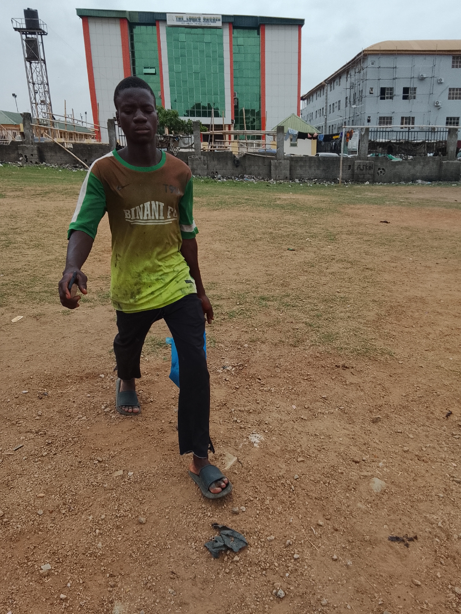 A young man walks across a dirt and grass field. He wears a stained green and brown t-shirt with the word "BINANI" on it, black pants, and open-toed sandals. He carries something in his left hand. Beh…read more