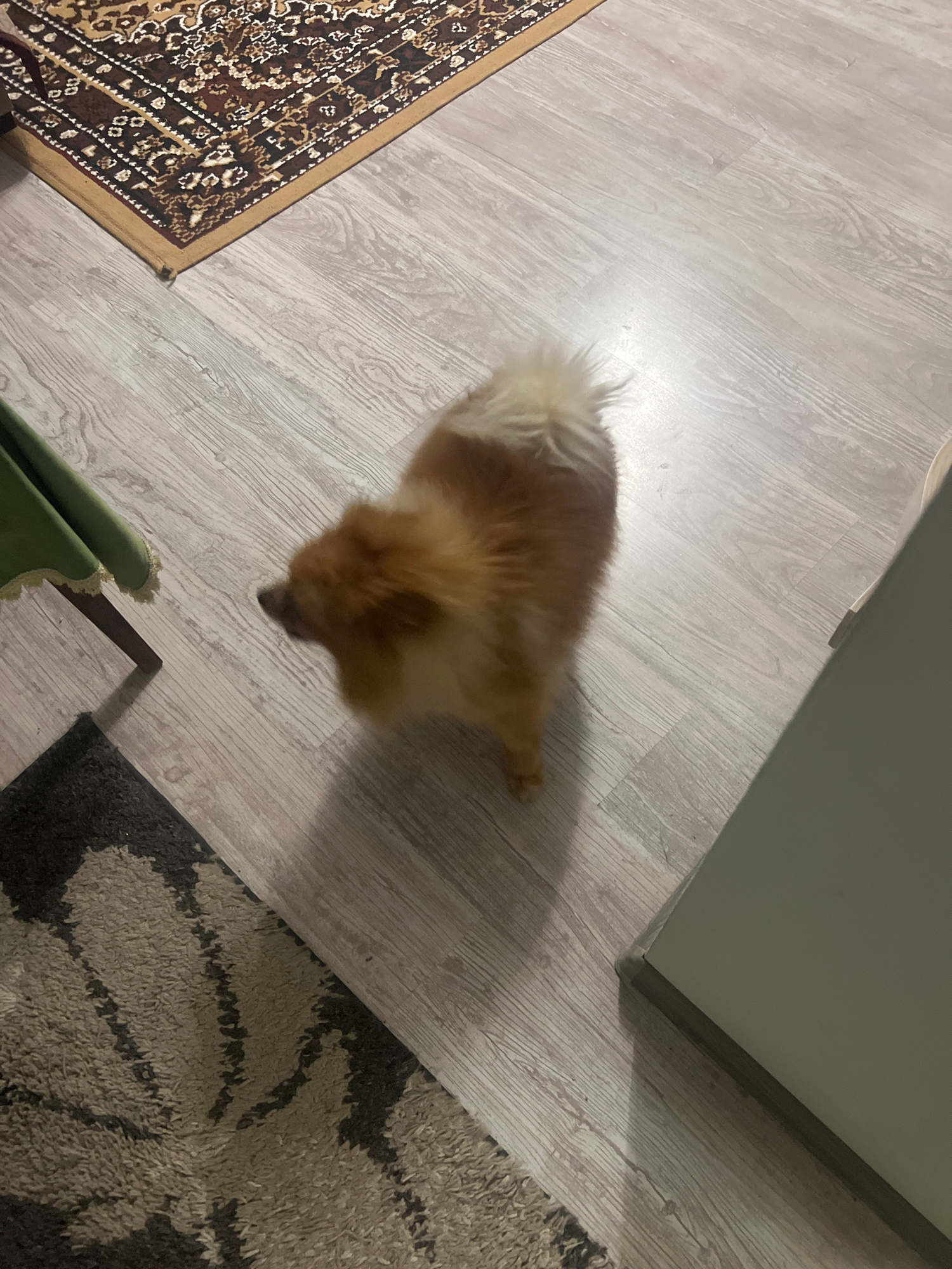This image depicts an indoor scene in Asenovgrad, Bulgaria. A small, fluffy dog with reddish-brown and cream fur is standing or in motion on a light grey wood-grain laminate floor, its head slightly b…read more