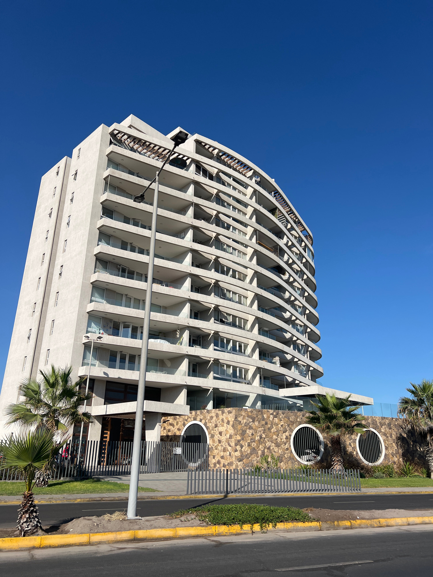 The image shows a tall, modern apartment building in Arica, Chile, angled against a clear blue sky. The building features a curved facade with repeating concrete arches supporting balconies. The lowerβ¦read more