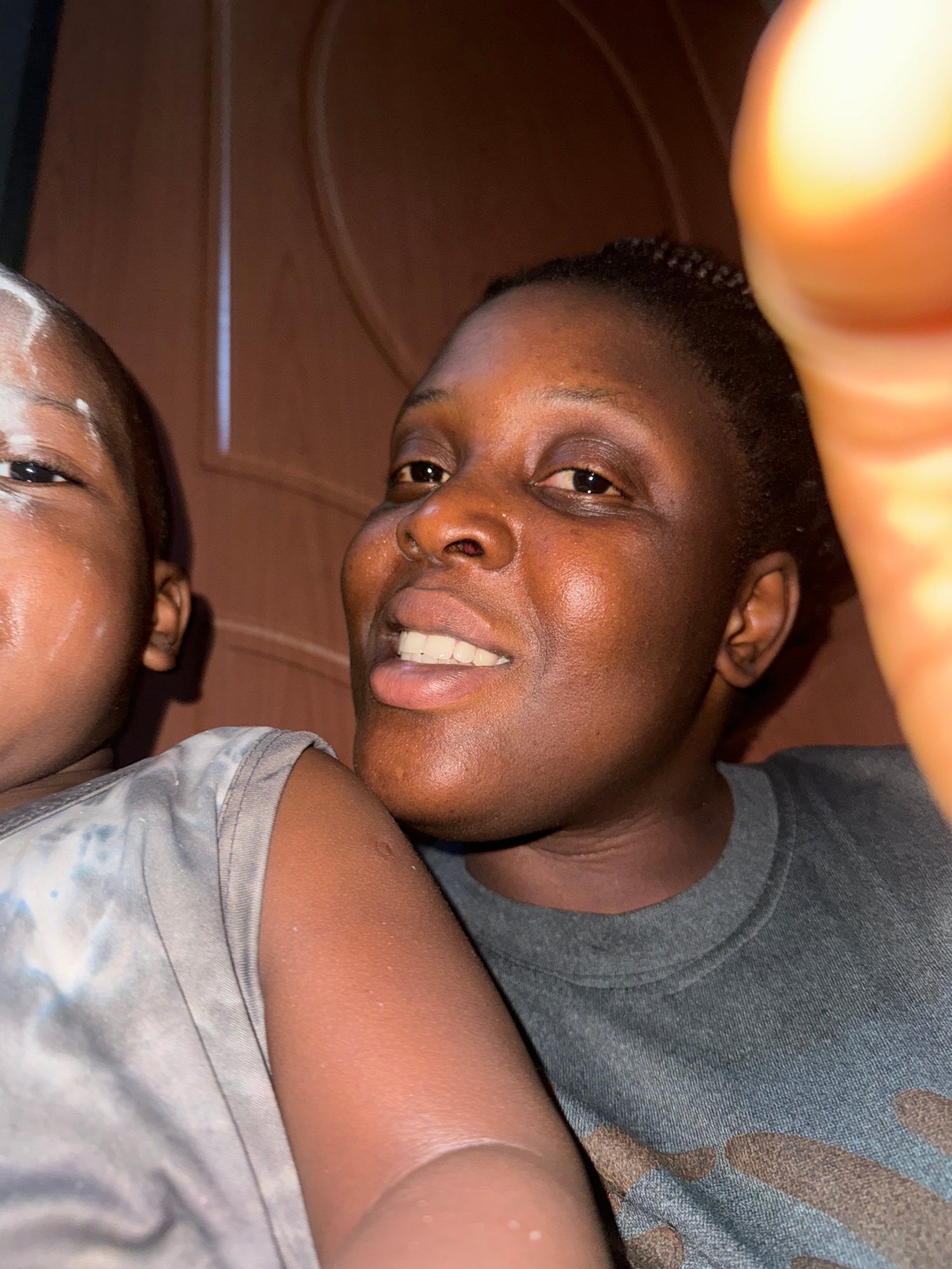A close-up, indoor shot shows two dark-skinned individuals, possibly a mother and child, in Sabon Tasha, Nigeria. The adult is visible from the chest up and is smiling slightly with teeth showing. Theβ¦read more
