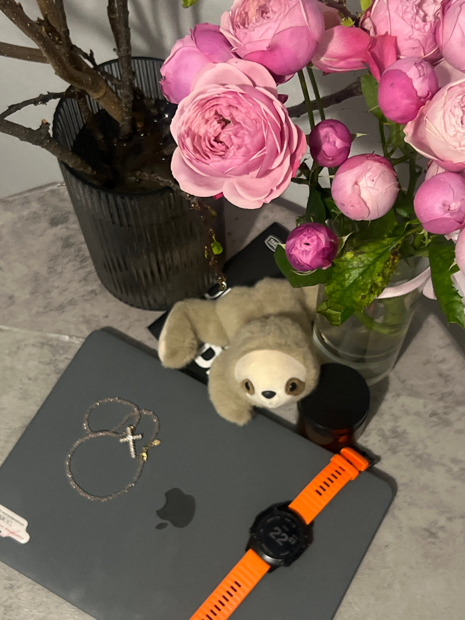 The image presents an overhead shot of various objects arranged on a surface, likely a table, with no indication of a specific location in Kazan or Russia. Dominating the left side is a vase filled w…read more