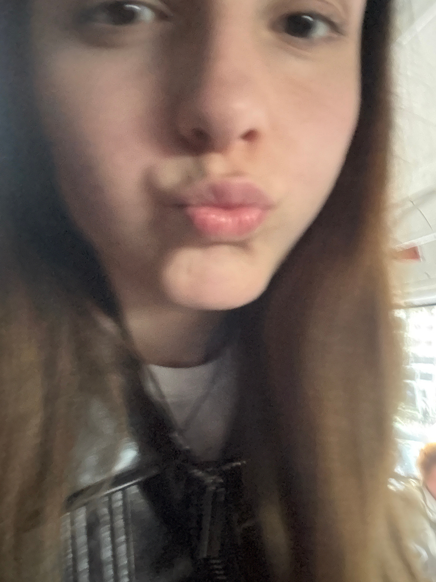 A close-up, tilted selfie captures a person with fair skin, brown hair, and dark eyes. The person is pouting. A white t-shirt collar is visible. Behind the person is a blurred background showing what…read more