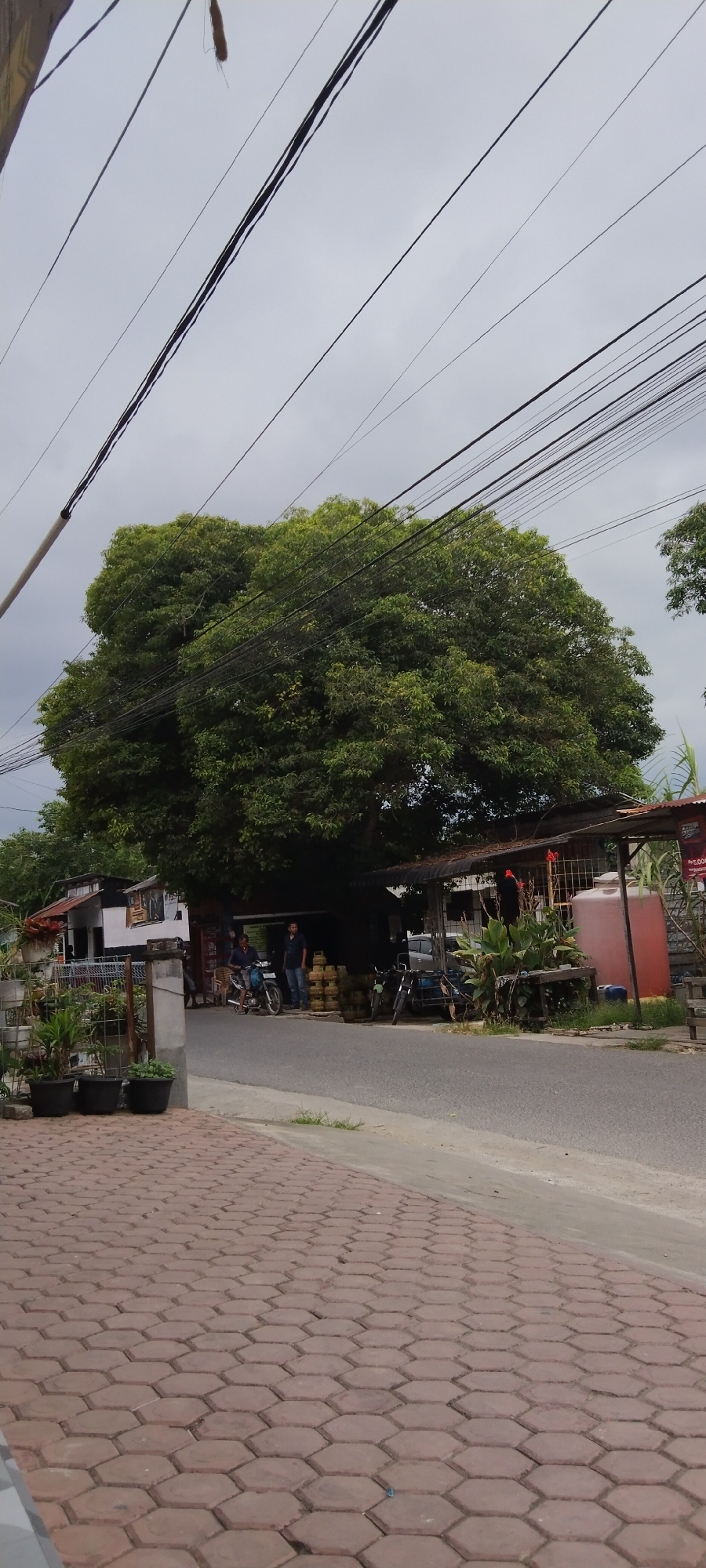 The scene is a street view in Bireuenmeunasahdayah, Indonesia, under a cloudy sky. A large, leafy tree dominates the view, with numerous power lines running through its branches and across the sky. In…read more