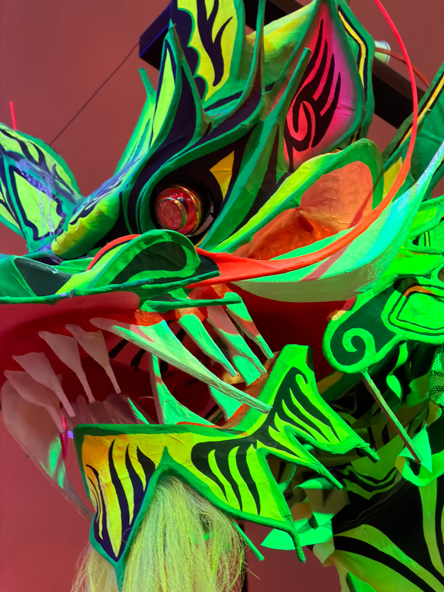 The image shows a close-up of a colorful, illuminated dragon head, likely part of a performance or parade. The dragon is constructed from materials such as paper and fabric, featuring a vibrant palett…read more