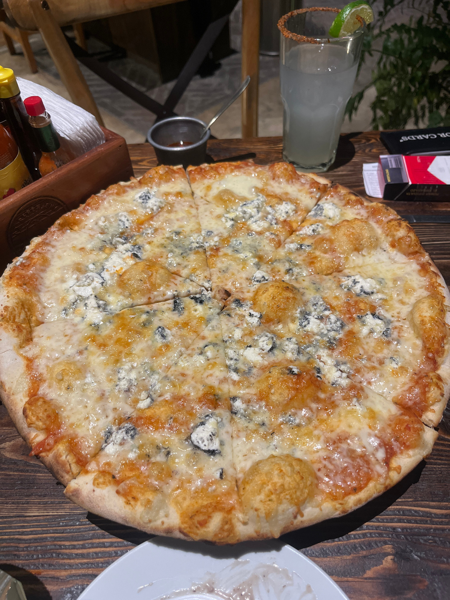 The image captures a scene at what appears to be a restaurant in San Andrés Cholula, Mexico. A large pizza, cut into several slices, dominates the center of the frame. It has a light-colored crust and…read more