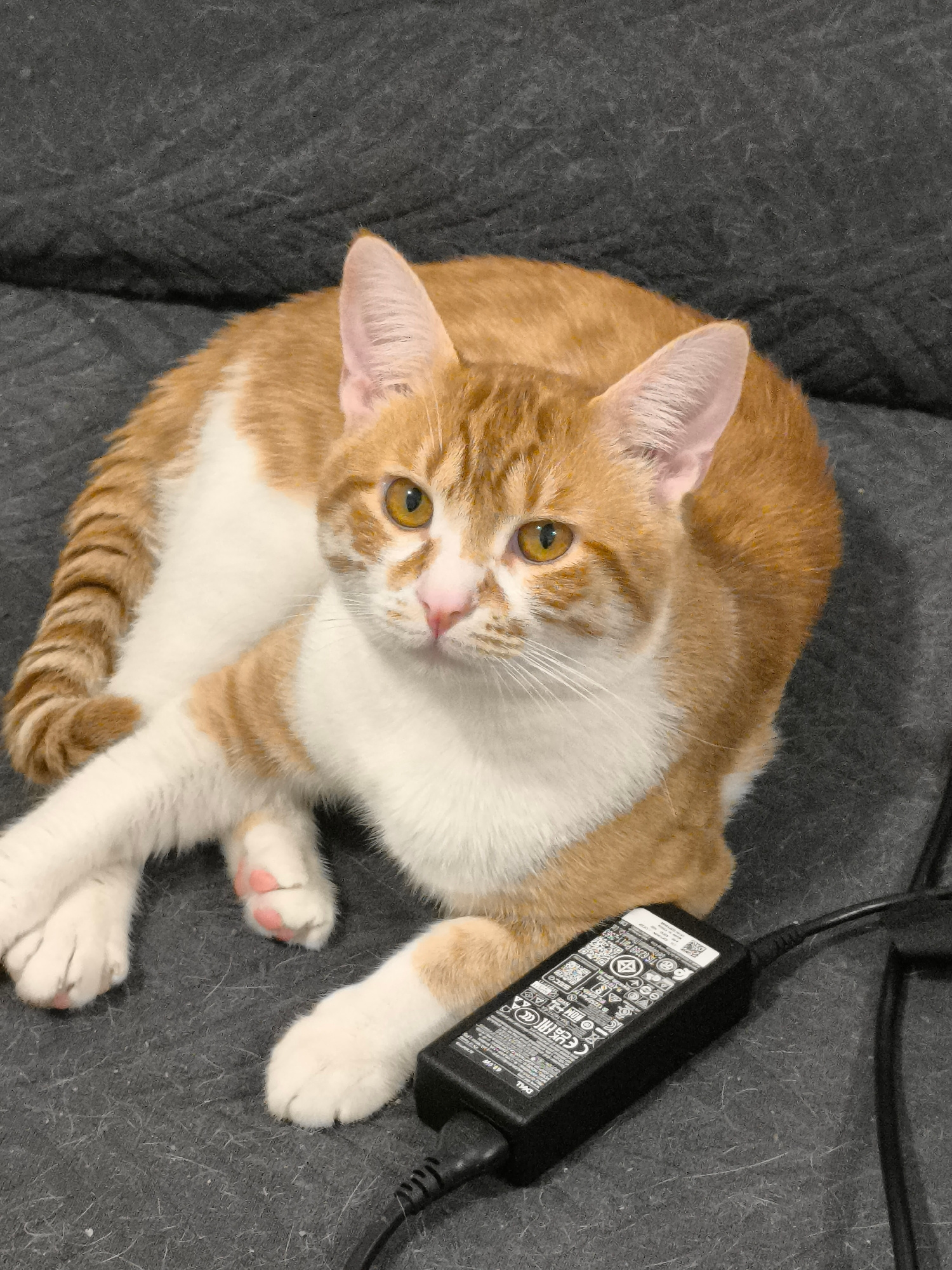 A medium shot depicts a ginger and white cat lounging on a grey, textured surface, likely a sofa or cushion. The cat is lying down with its paws crossed. A black laptop power adapter with an attached…read more