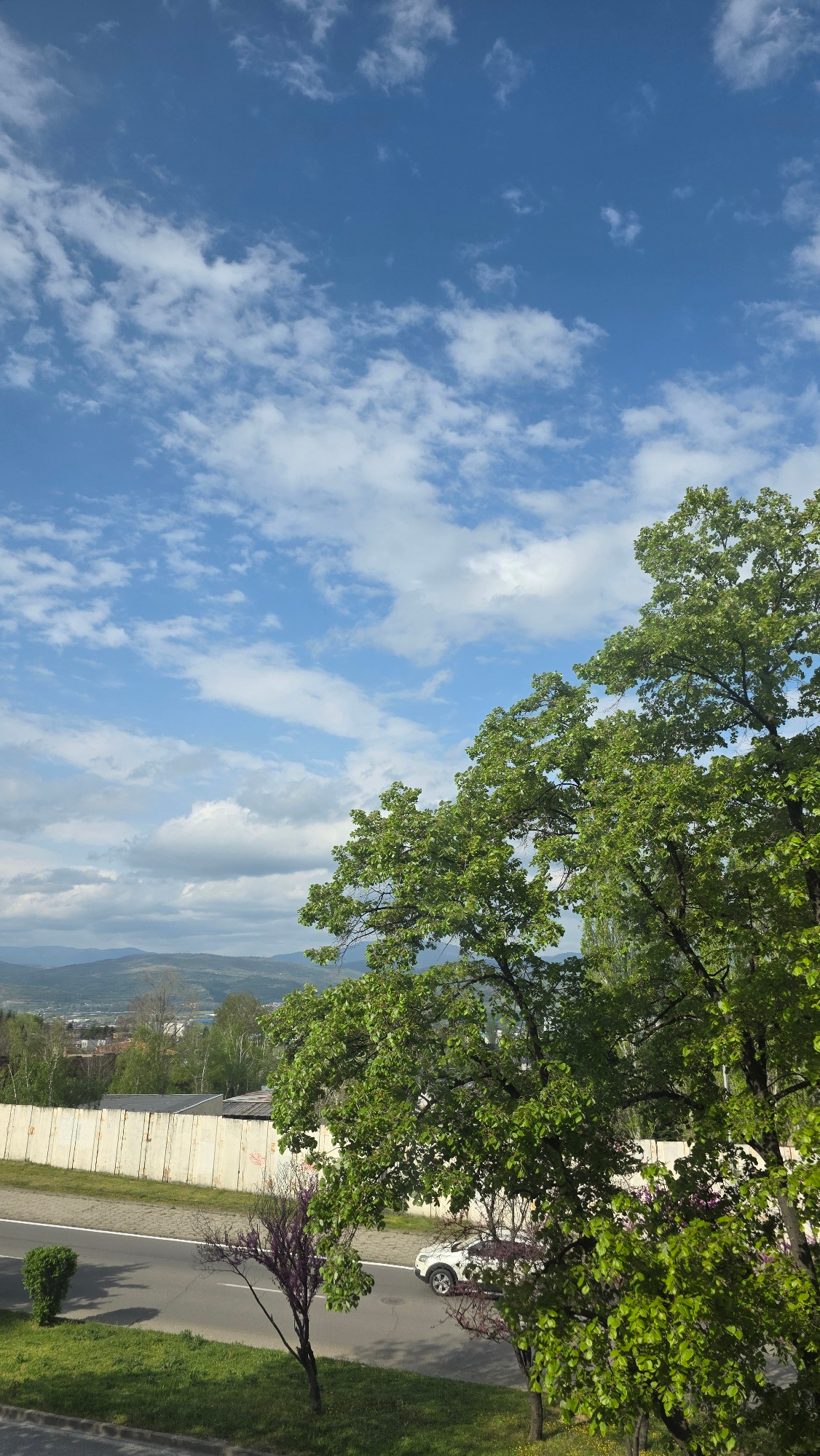 The image, viewed in an upright orientation, depicts a serene, sunlit landscape scene from Blagoevgrad, Bulgaria, likely captured during late spring or early summer. The top portion of the frame is do…read more
