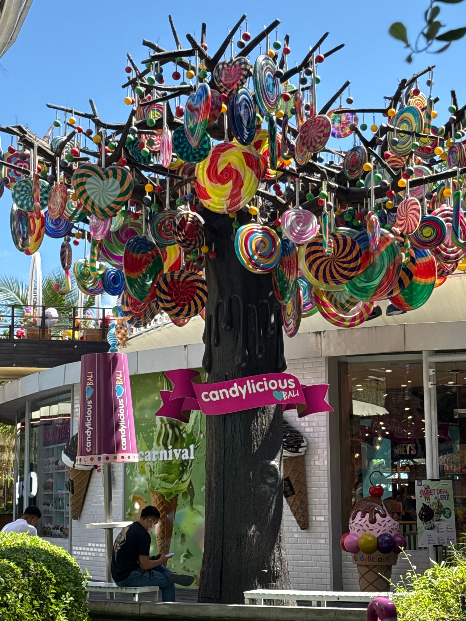Here is a detailed description of the image: **Scene:** An outdoor display in Kuta, Indonesia, featuring a "Candylicious Bali" tree. **Objects:** The tree is adorned with numerous artificial lollipo…read more