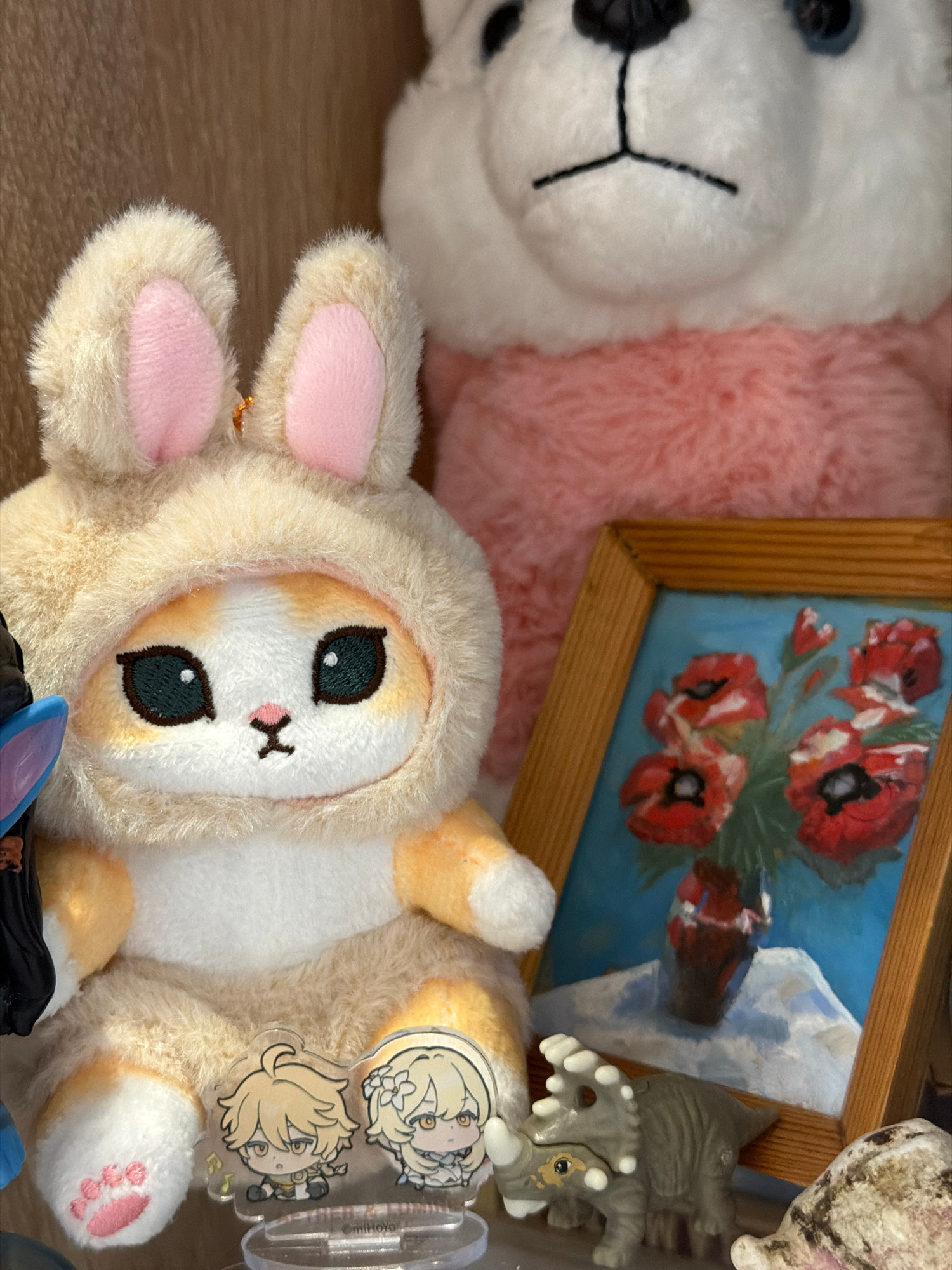 The image shows a collection of objects on a wooden surface. In the foreground, a plush bunny toy with pink ear pads and a tan hooded jacket lays on its back. Its face features black eyes and a small,…read more